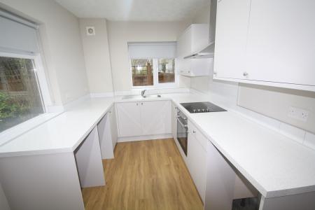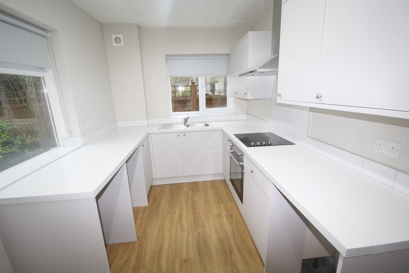 Modern galley kitchen with integrated appliances and breakfast area . Rear door leads into well maintained private patio garden.