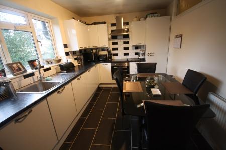 The modern galley kitchen provides space for a dining table and is complete with fashionable high gloss tiles and integrated appliances.