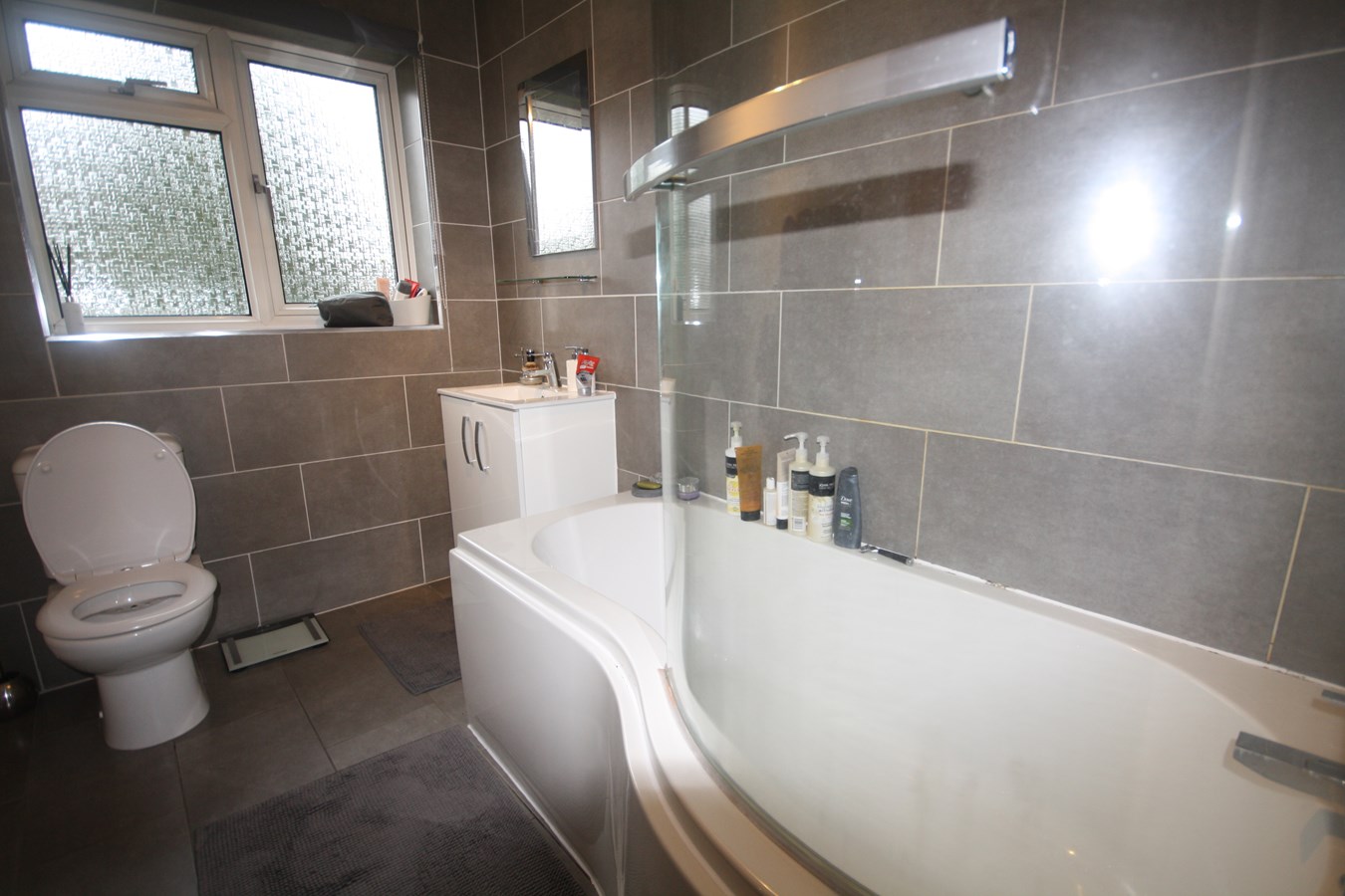 Recently fitted bathroom suite with 'P'shape bath, shower and stylish grey tiling.