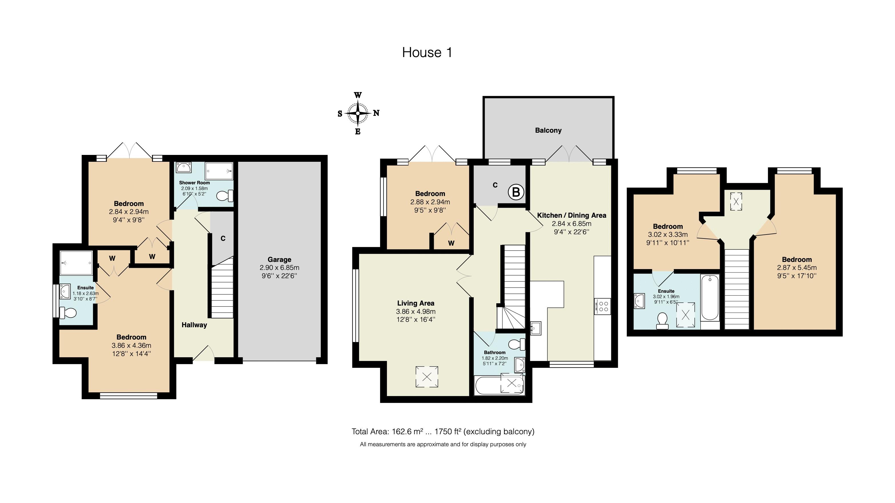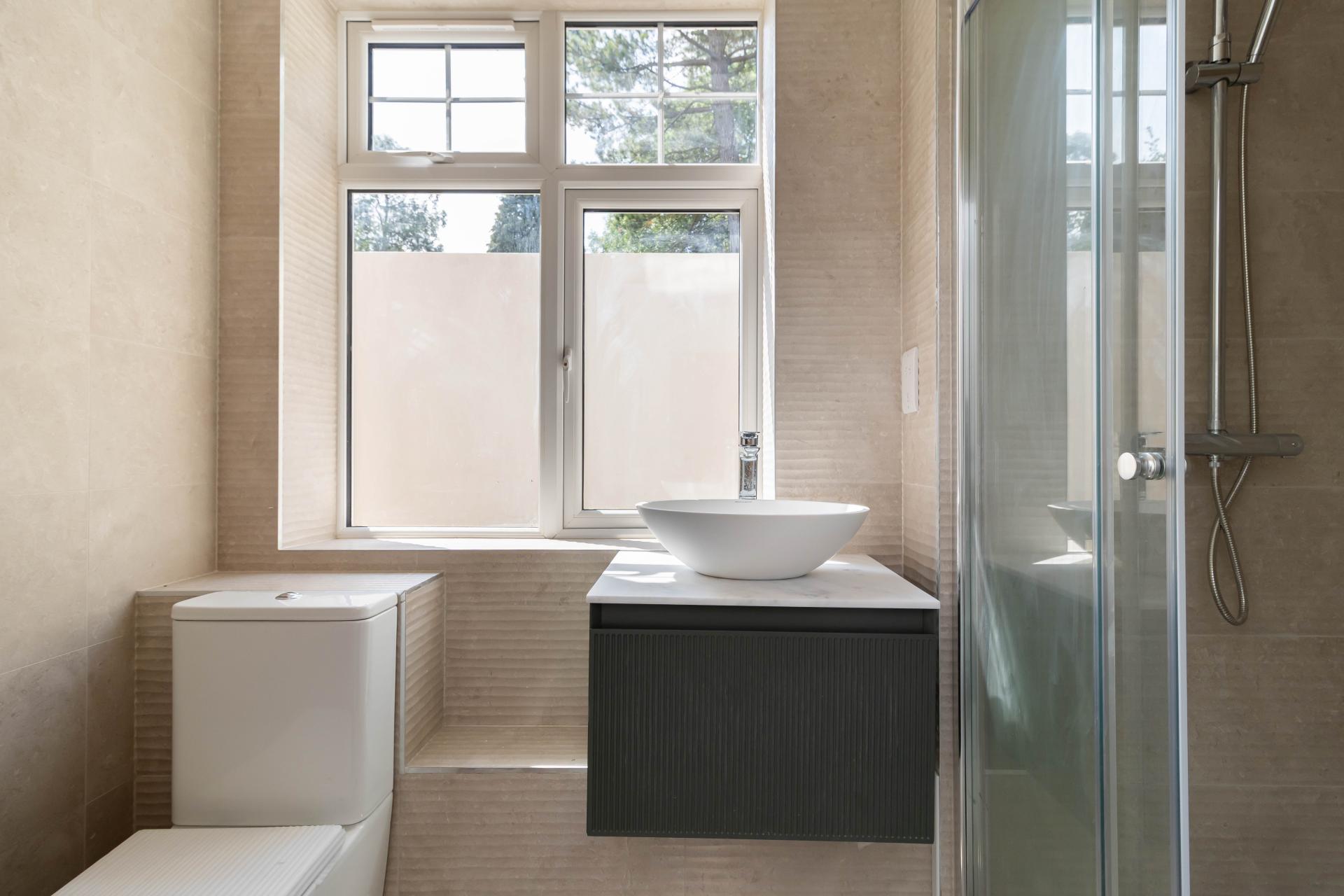 The ground floor features two bedrooms, one with an en suite and direct access to a private courtyard, along with a separate shower room.
