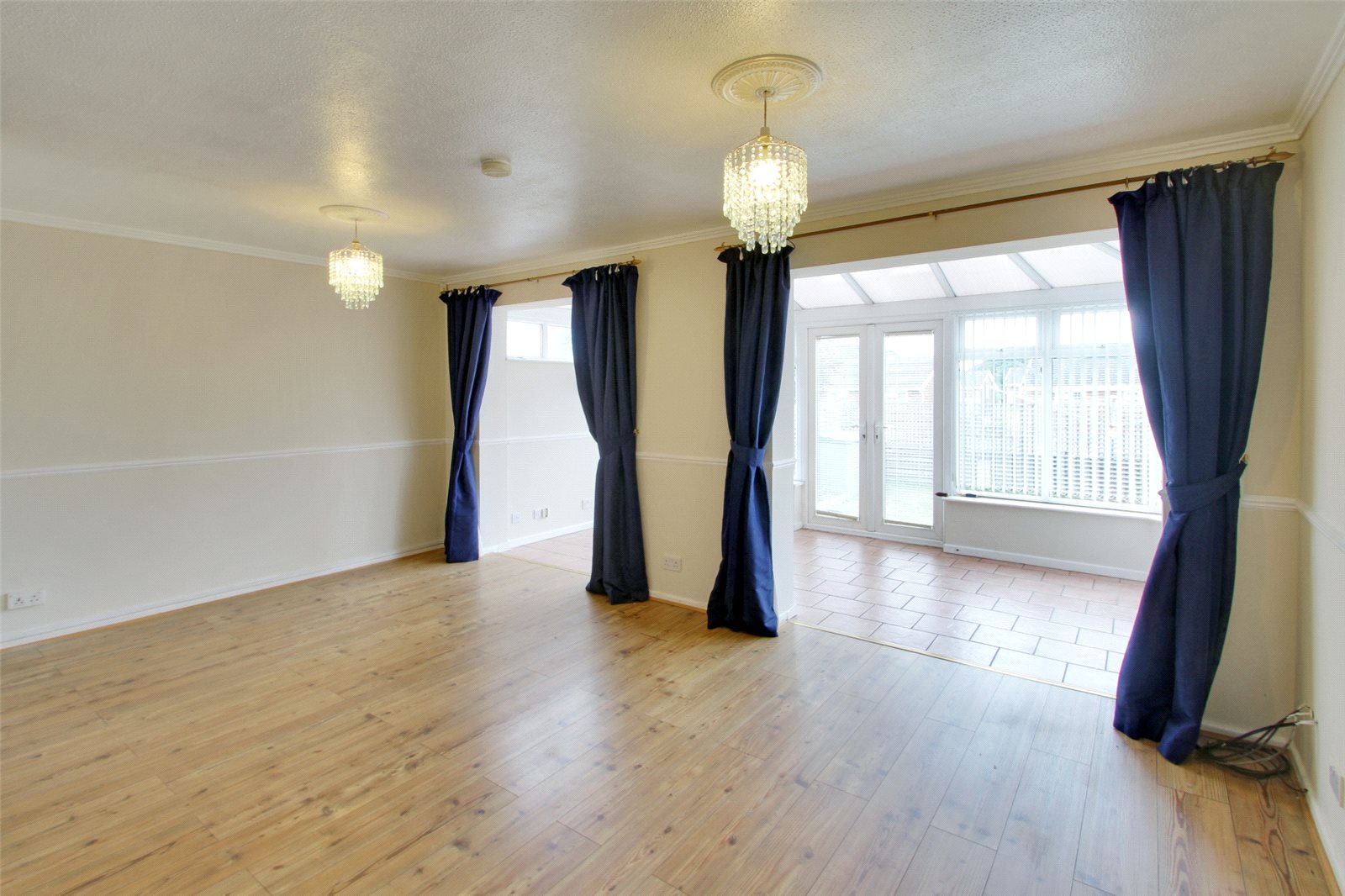 Sitting Room 17'5" (5.3m) x 13'1" (4m) narrowing to 9'11" (3.02m). Open plan to conservatory. Laminate flooring. Textured and coved ceiling. Dado rail.