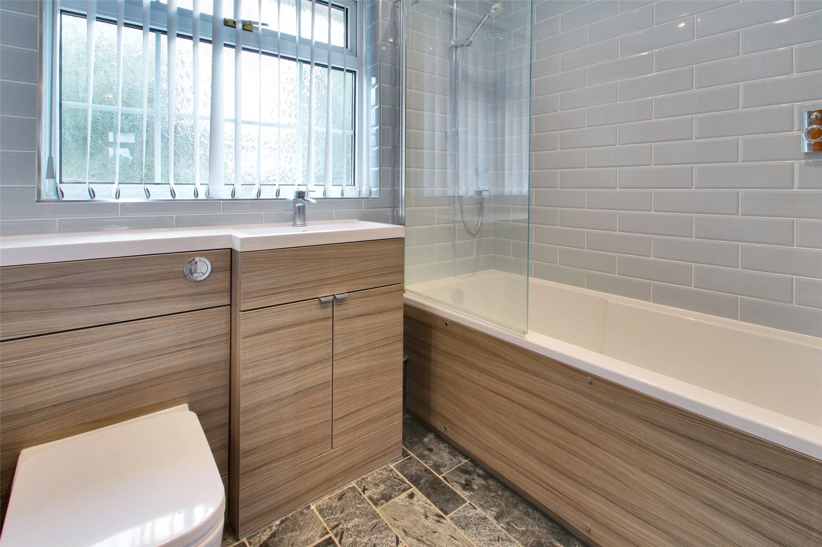 Bathroom 7' x 5'6" (2.13m x 1.68m). Double glazed frosted window to rear. Vinyl flooring. Plain ceiling with downlighters. Heated towel rail. Panelled bath with shower over and shower screen. Wash hans bain with vanity unit. Low level flush W.C. Tiled walls. Wall mirror.
