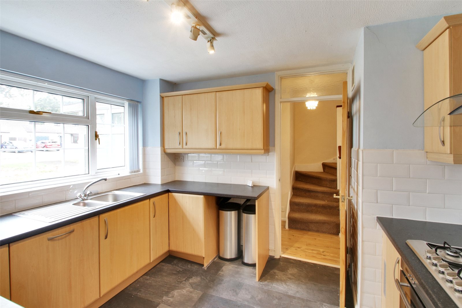 Entrance Hall Panelled door to front. Laminate flooring. Textured ceiling. Stairs leading to landing. Cupboard housing boiler.