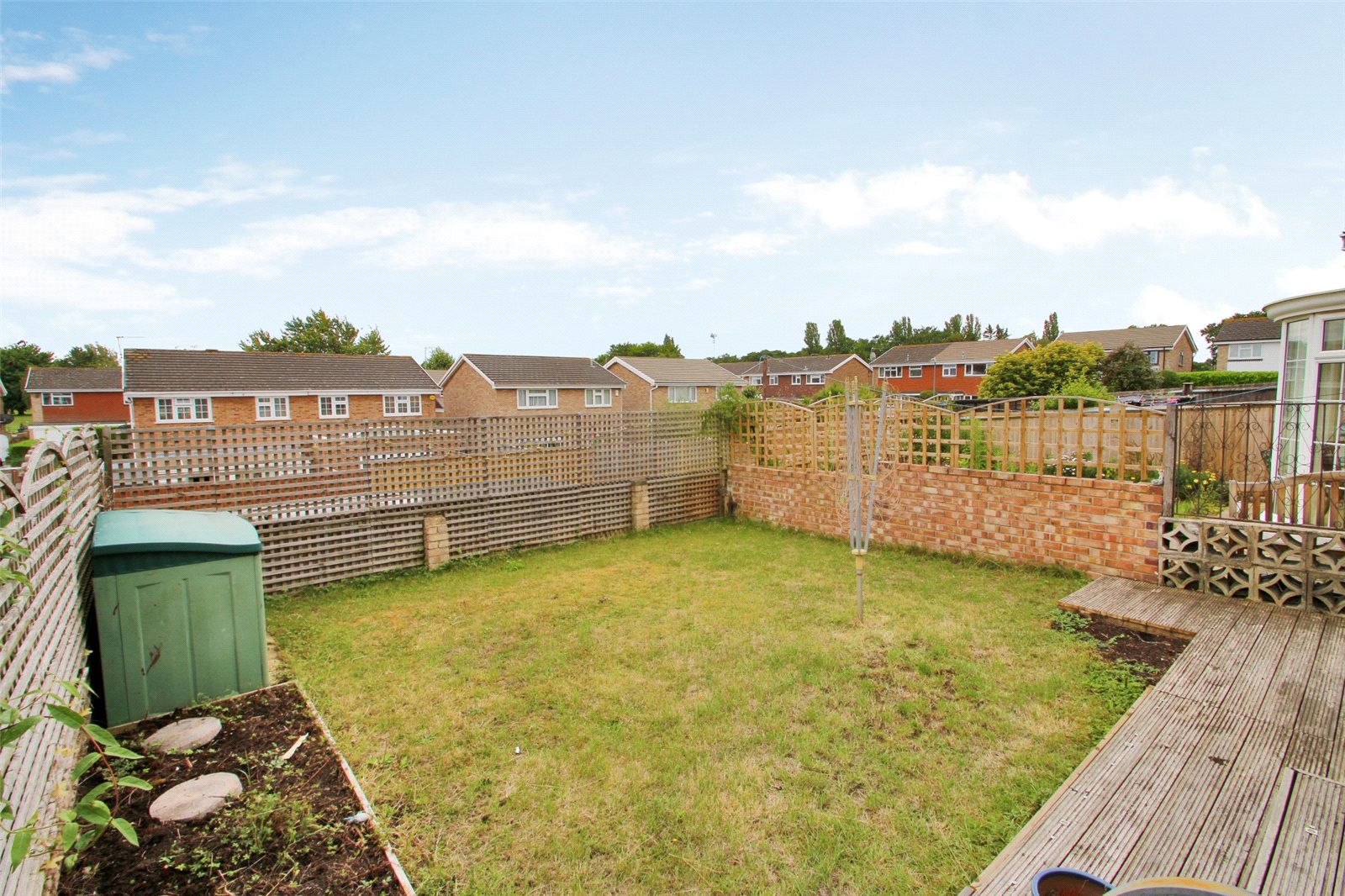 Garden 22' x 19' (6.7m x 5.8m). Decking area. Laid to lawn. Walled and fenced. Flower beds. Side access.
