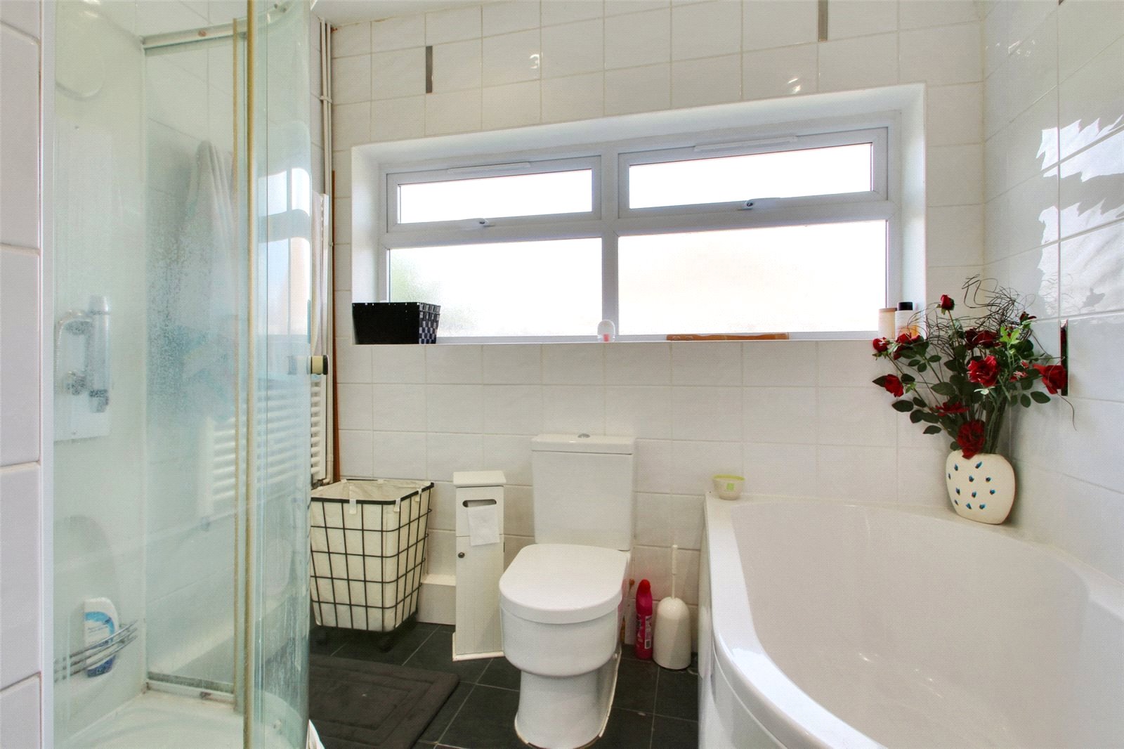 Bathroom 10'7" x 8'2" (3.23m x 2.5m). narrowing to 77 Double glazed window to side. Comprising shower cubicle with power shower. Panelled bath with mixer tap and hand shower. Pedestal wash hand basin. Close coupled wc. Feature tiling. Inset spotlights. Towel radiator.