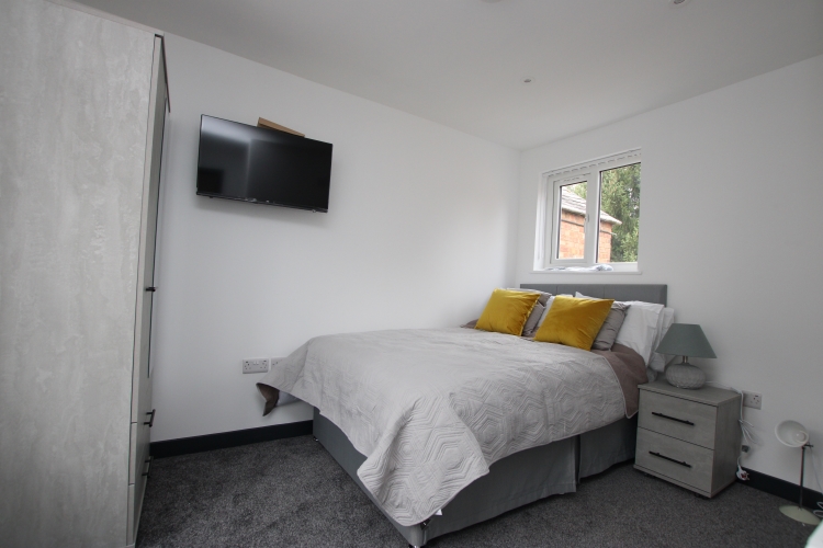 The room comes complete with a double bed, grey matching bedside cabinet and 2 door wardrobe, desk with swivel chair and smart TV. The ensuite features a built in wash basin and shower room.