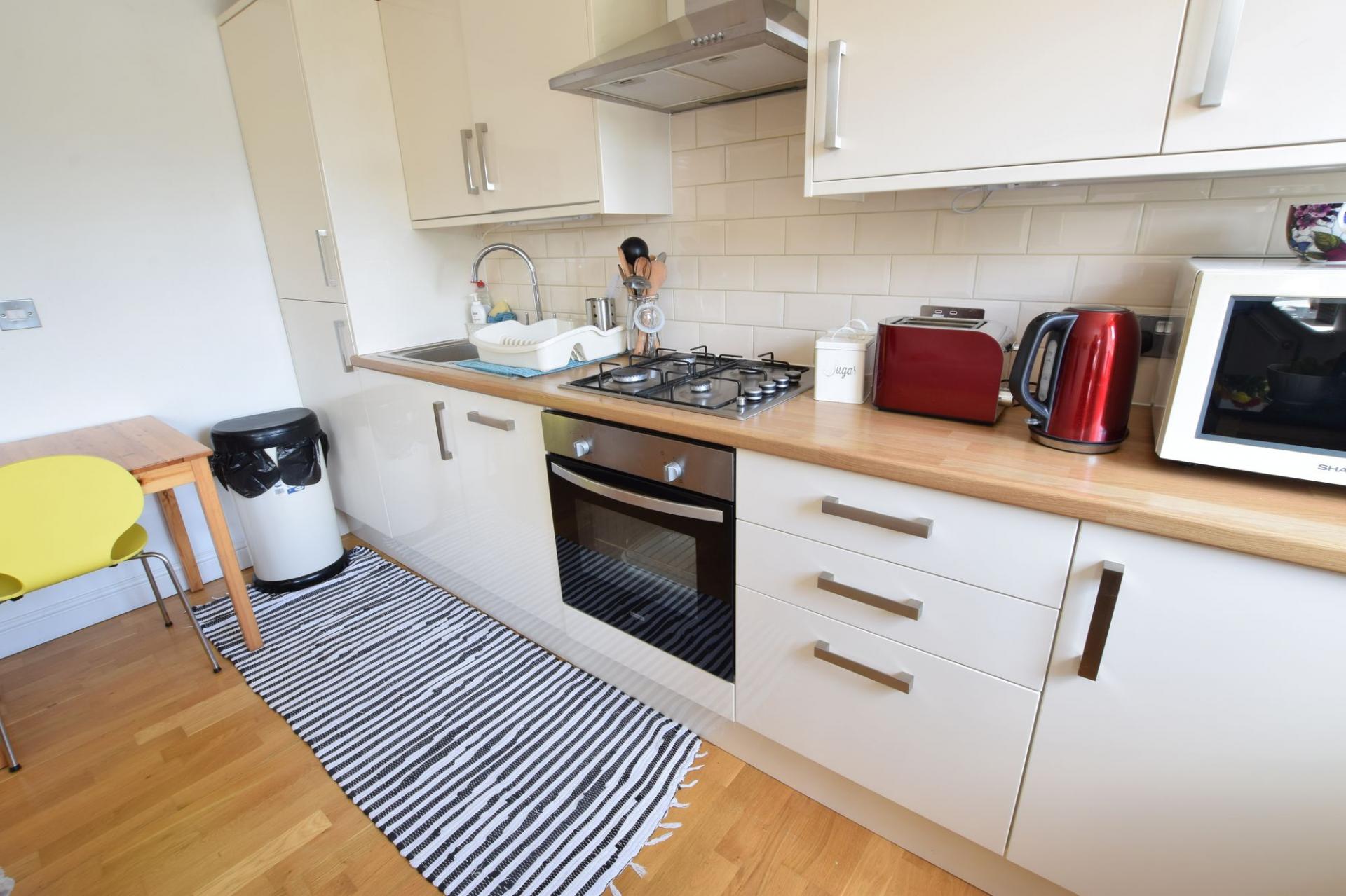 Modern one bedroom first floor apartment located in Yarnton, only a few miles from Oxford. The property comprises a communal entrance hallway leading to the apartment front door, open-plan fitted kitchen with appliances, double bedroom with a walk-in wardrobe, and bathroom with electric shower over the bath. The property also includes driveway parking, gas central heating, and double glazing.