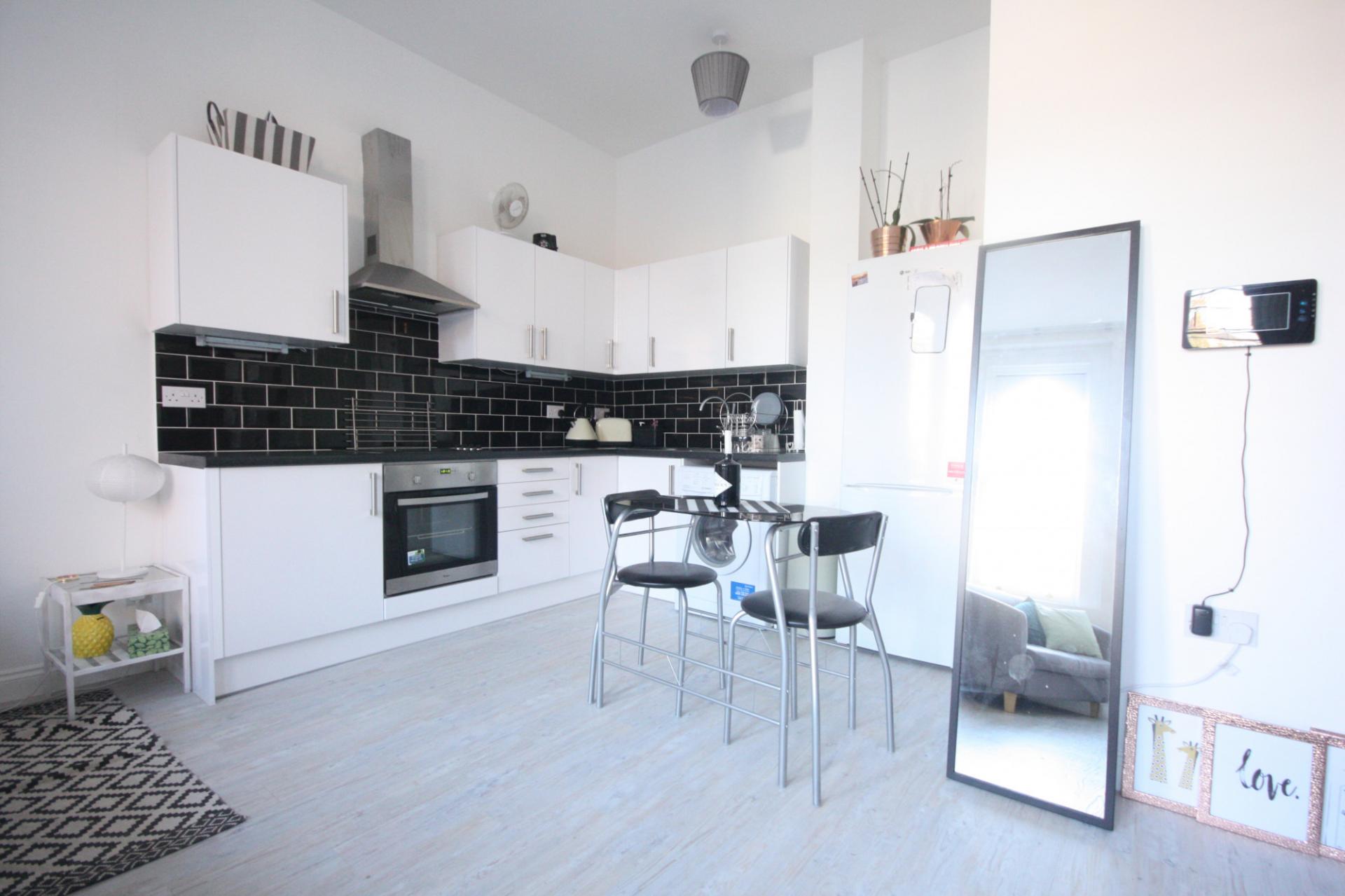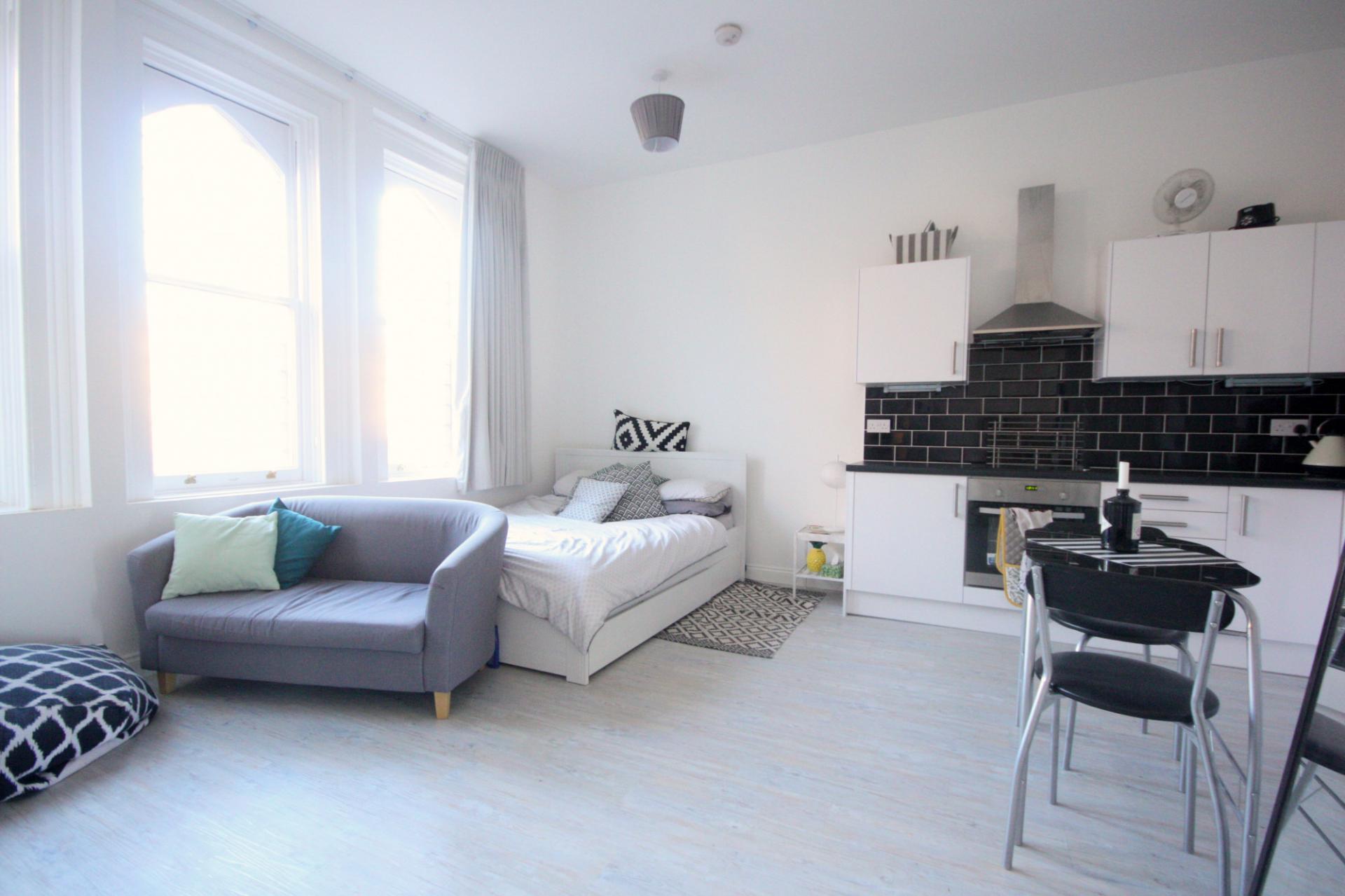 A modern and tastefully designed ground floor studio flat on London Road, with high ceilings, large windows, a modern kitchen and bathroom.