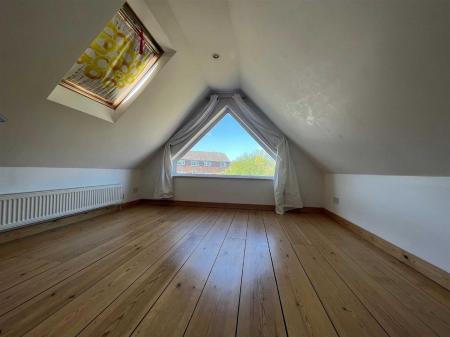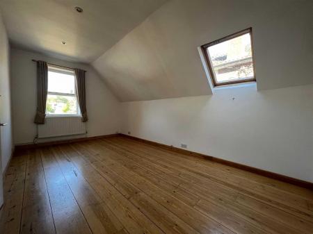 Master Bedroom - 3.61m max x 3.43m max - Double glazed triangular picture window to rear, double glazed Velux window to side, timber floor, two recessed areas for storage, sloping ceiling with inset ceiling spots.