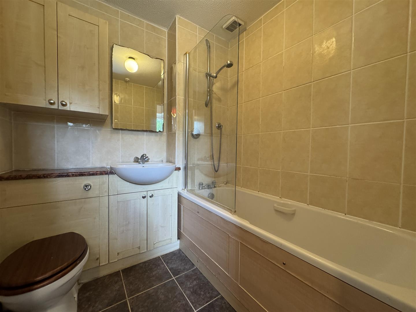 Bathroom - White suite comprising of a panelled bath with mixer tap, low level WC with concealed cistern, hand wash basin, fitted power shower, mirror, tiled walls, ceramic tiled floor.