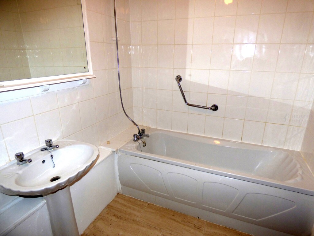 Matching white suite comprising: panel enclosed bath with wall mounted mixer shower, wash hand basin & low level WC. Fitted mirror & shaver point. Extractor fan. Vinyl floor.