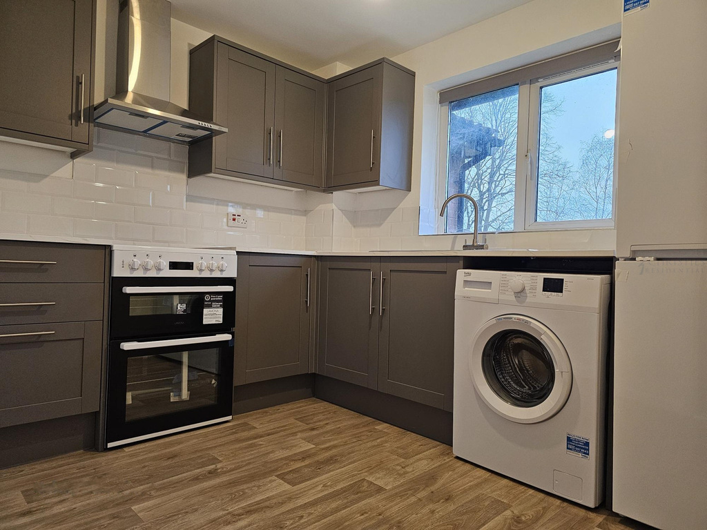 Double glazed window. Range of new fitted wall & base units with inset 1 & 1/2 stainless steel sink. New freestanding electric cooker, fridge/freezer & washing machine. Part tiled walls. Vinyl floor.