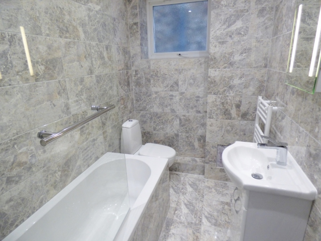 Matching tiled wiled walls & flooring. Extractor. Fitted mirror with light & shaver point.