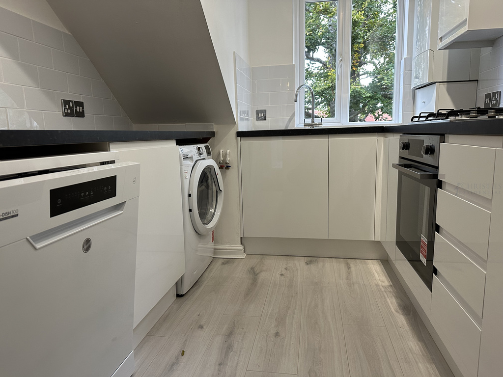 Double glazed window. New white gloss fitted kitchen with inset stainless steel sink unit. Electric oven & 4 ring gas hob with extractor hood over, freestanding fridge/freezer, dishwasher and washer/dryer. Wall mounted 'Worcester Bosch' gas central heating boiler.