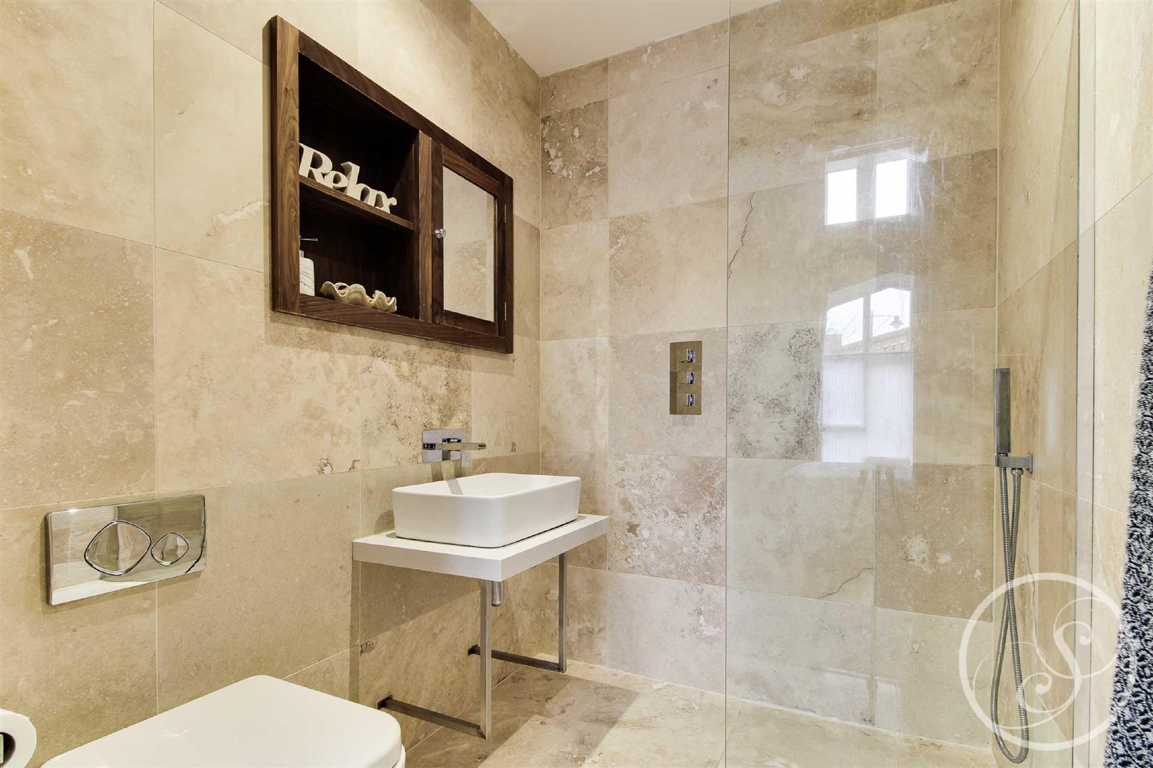 Ensuite - Fully travertine tiled en-suite with walk in shower, wash hand basin, W.C and built in feature storage cupboard.