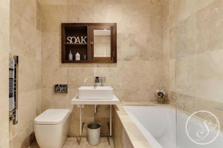 Bathroom - Fully travertine tiled bathroom comprising bath with shower over, wash hand basin, W.C and built in feature storage cupboard.