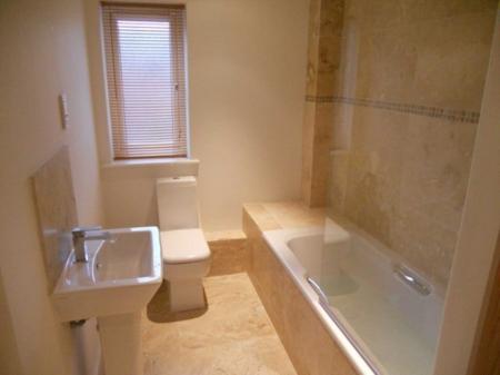 Panelled bath with shower over, low flush wc and hand wash basin.