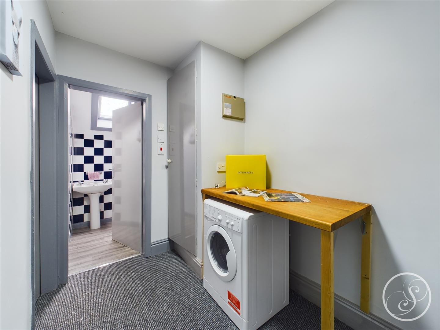 With separate cupboard housing plumbing and space for washing machine and dryer.