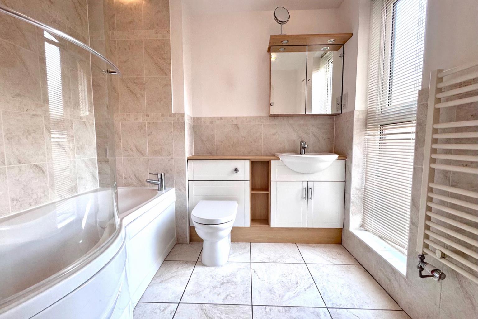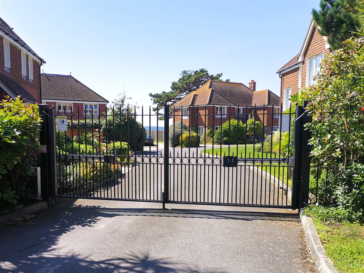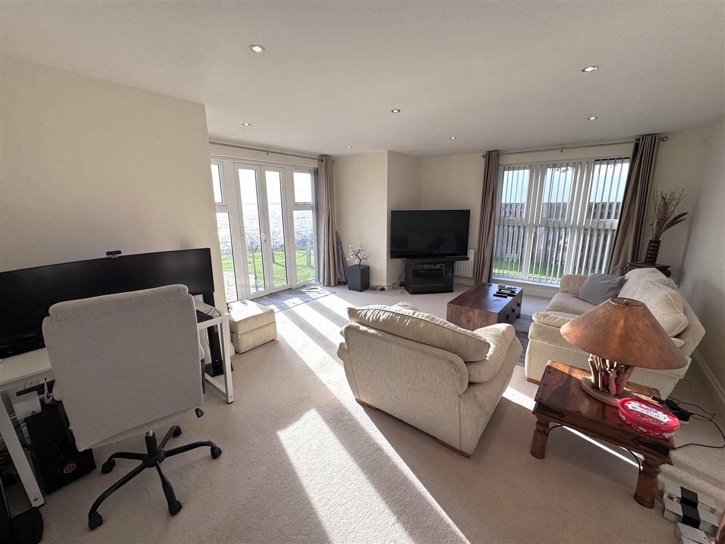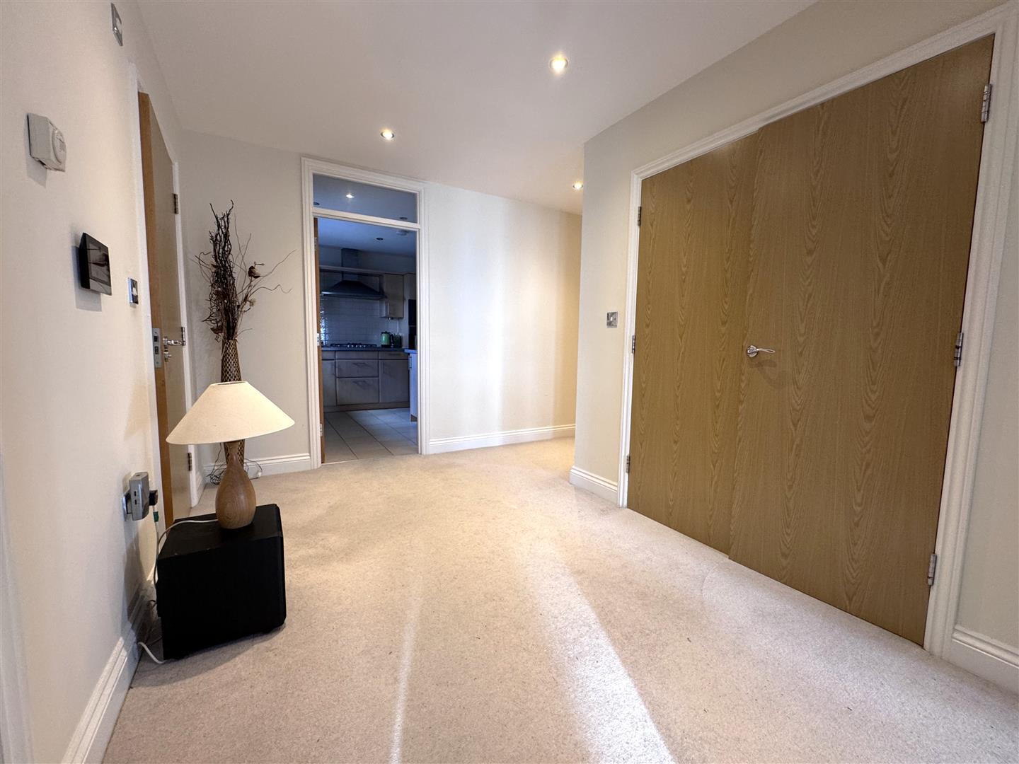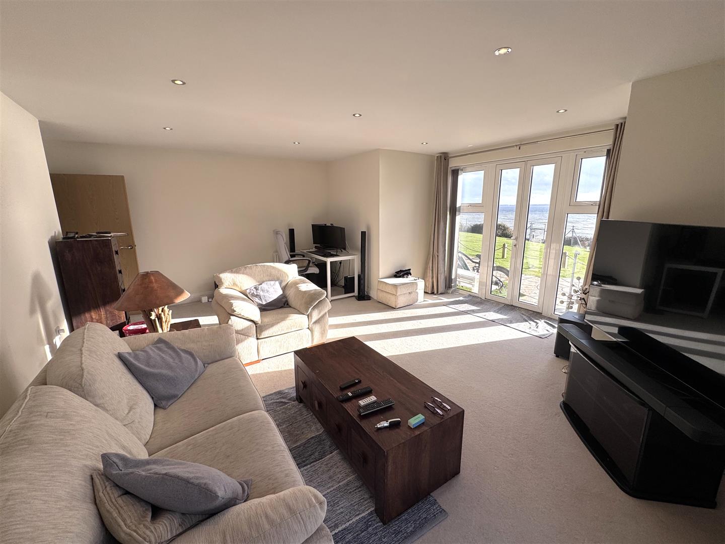 The apartment features two generous double bedrooms, with the principal bedroom benefiting from fitted double wardrobes and a modern en-suite shower room. A well-appointed main bathroom serves the second bedroom and guests. The contemporary kitchen is thoughtfully designed with an island unit and a full range of integrated appliances. The separate lounge benefits from French doors opening directly onto the garden, offering beautiful sea views beyond the sea wall. The hallway includes a large double storage cupboard, offering excellent practicality.