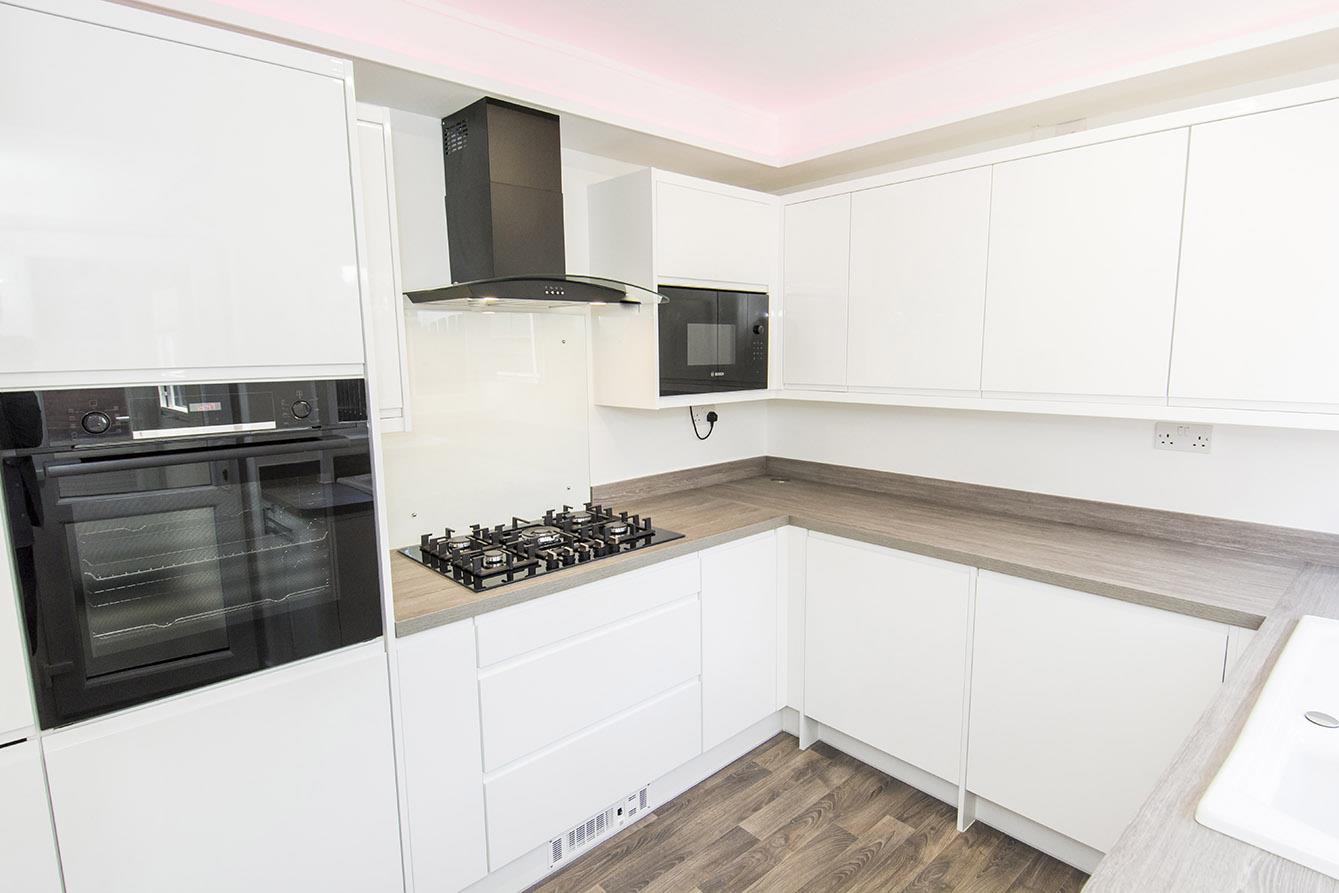 Kitchen - 3.45m x 2.57m (11'4" x 8'5") - Brand new fitted kitchen with a range of white high gloss fronted base and wall units. Laminated work surfaces and splash backs. Fitted oven and five ring gas hob with extractor hood over. Fitted microwave, refrigerator and automatic dishwasher. Enamelled one and a half bowl sink and drainer. Open storage cupboard. Double glazed window to the side. Opaque double glazed door to:-