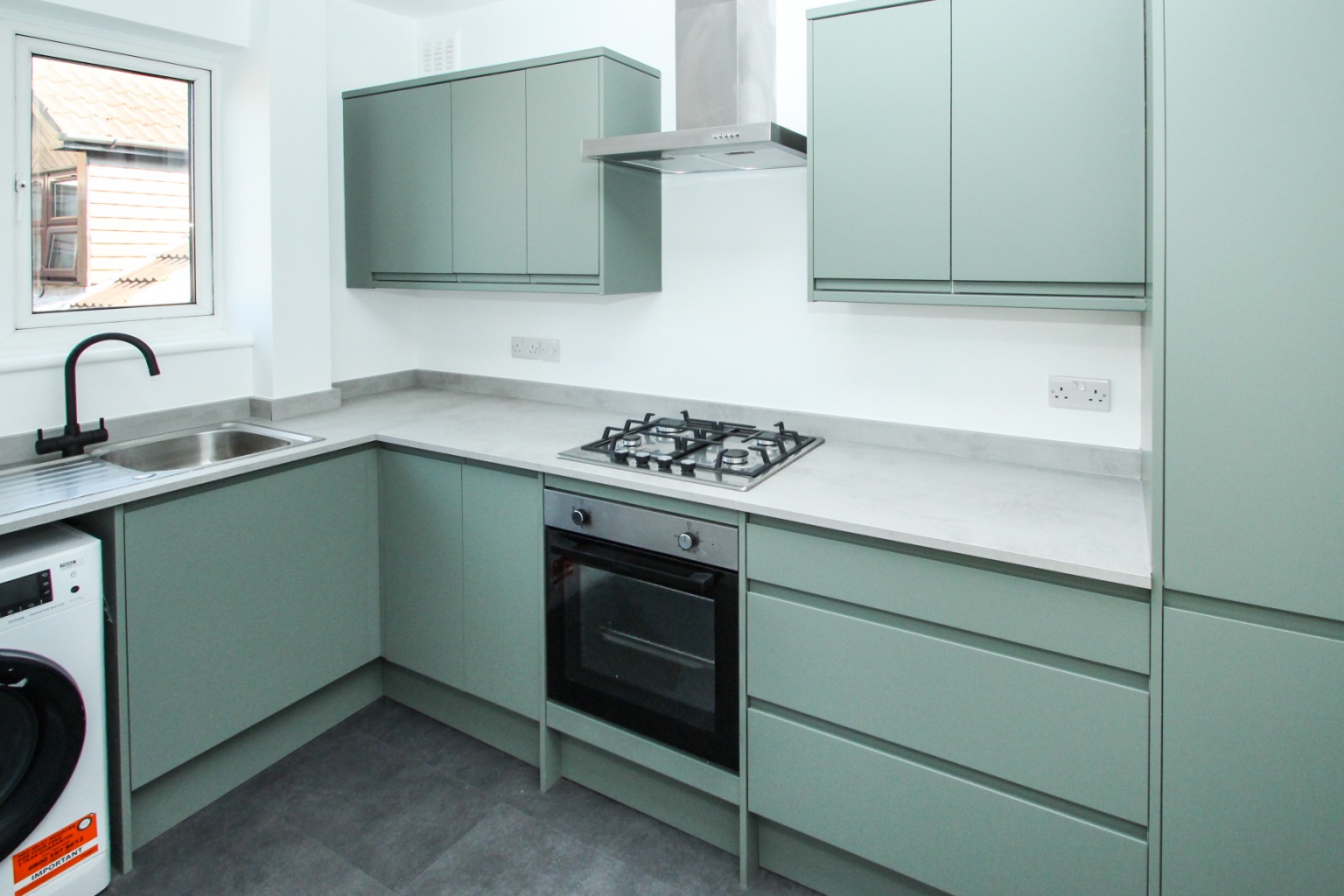 The kitchen has been completely remodelled with a stylish finish, and includes integrated fridge freezer, oven with gas hob and washing machine.
