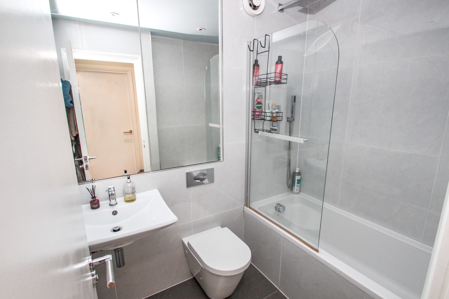 Heading down the hall, ands off to the left is the modern, three-piece bathroom with bath plus overhead shower and glass shower screen. There’s a large mirror above the sink with storage behind for day-to-day toiletries.