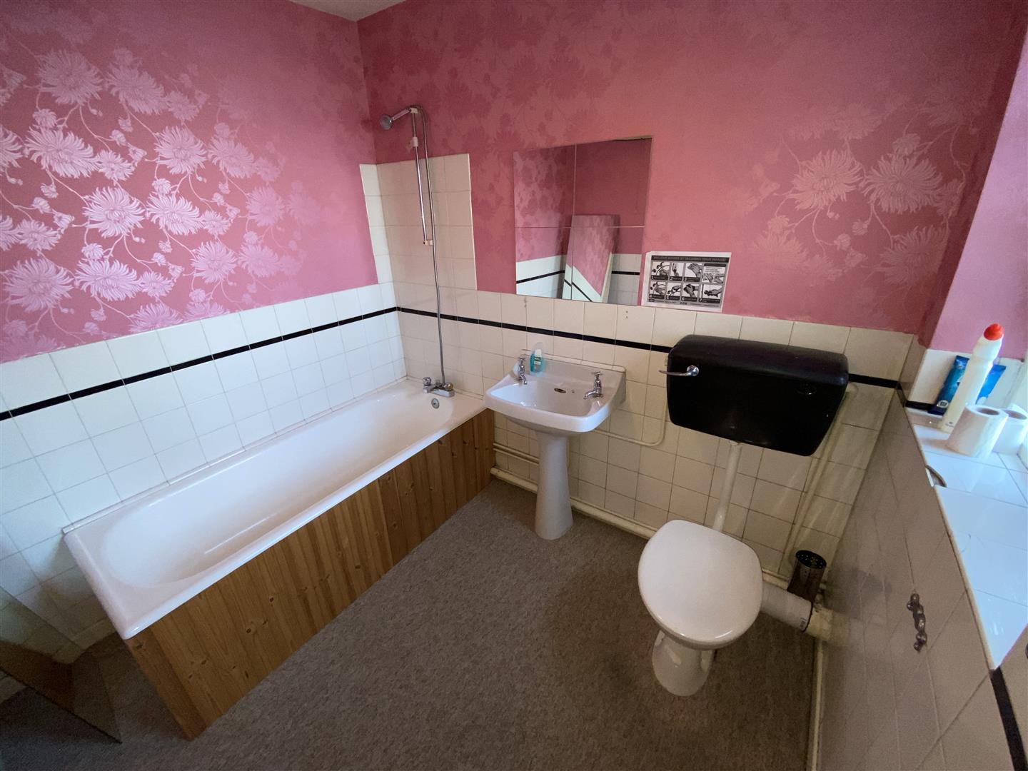 Bathroom: - 2.4 x 2.1 (7'10" x 6'10") - with fitted bath, pedestal wash hand basin, low flush w.c., part tiled walls, carpet flooring.