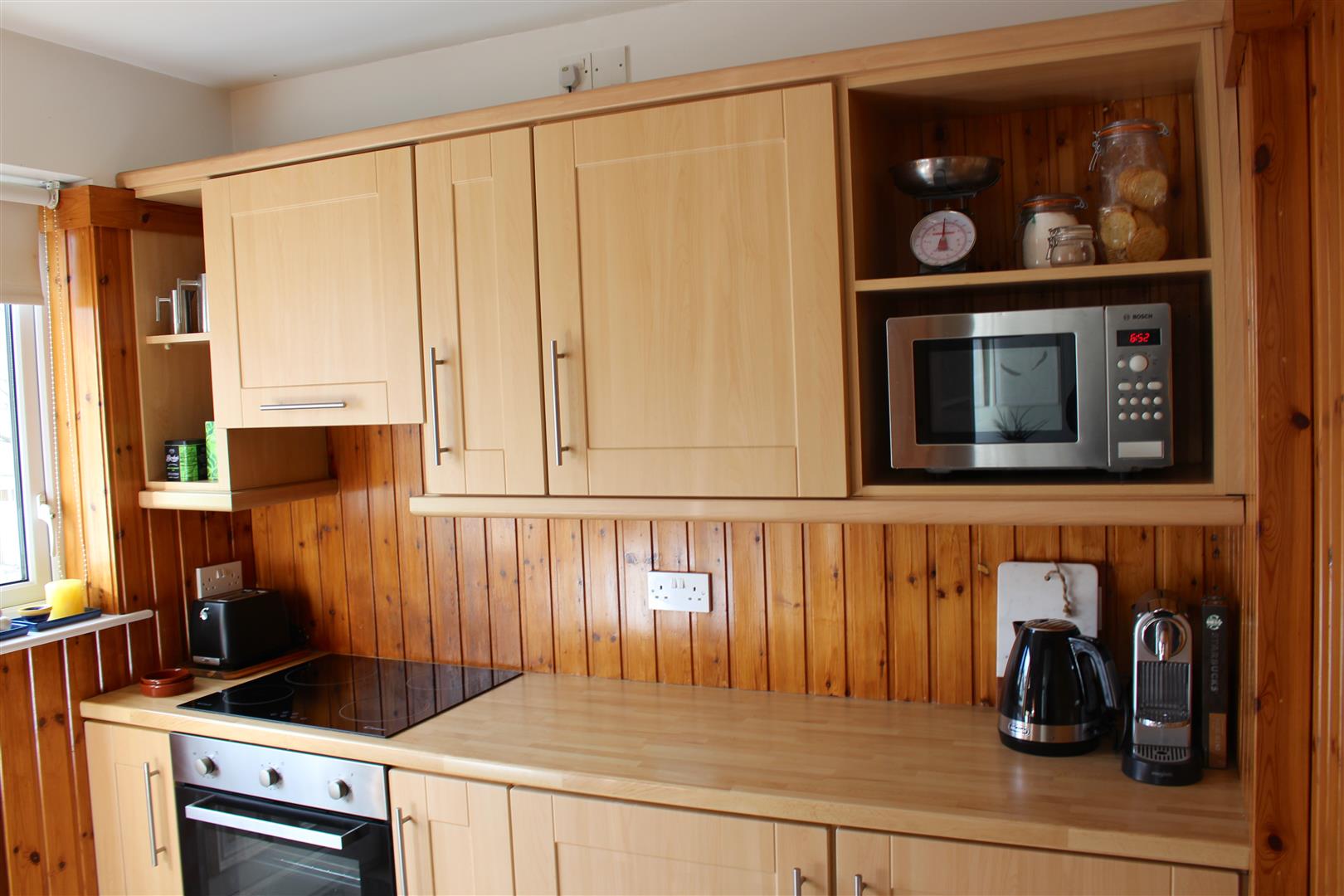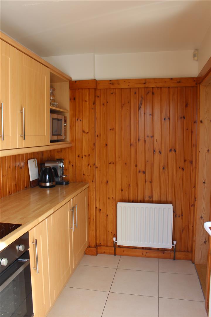 Kitchen: - 2.5 x 2.4 (8'2" x 7'10") - Fitted with a range of eye and low level units with matching work top. Under unit lighting. Stainless steel sink unit. Built in hob and oven. Extractor fan and light. Plumbed for dishwasher. Tiled flooring. Pine panelled walls.