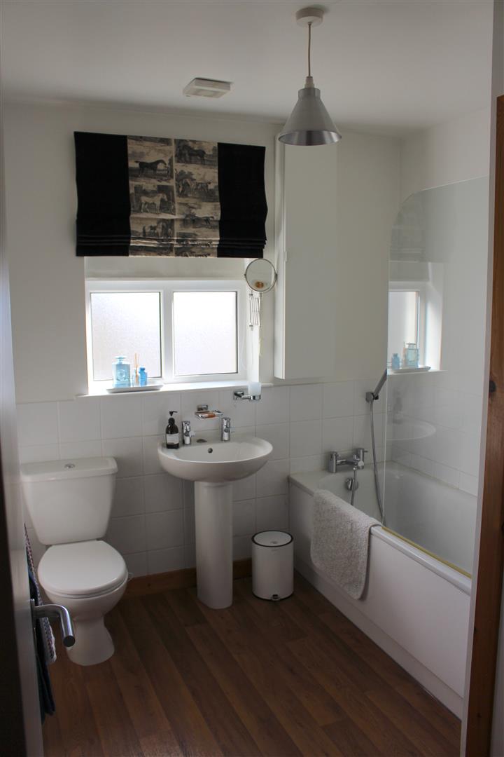 Bathroom: - 2.5 x 2.3 (8'2" x 7'6") - Four piece suite comprising a white bath, electric shower over bath, Low Flush W.C. and pedestal wash hand basin. Extractor fan. Cushion flooring. Part tiled walls.