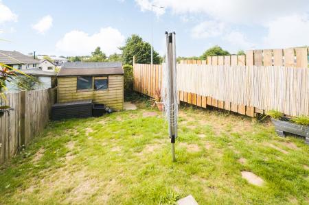 The south-facing rear garden enjoys excellent natural sunlight, making it an inviting space for relaxation. A gently sloped lawn leads to a garden shed.