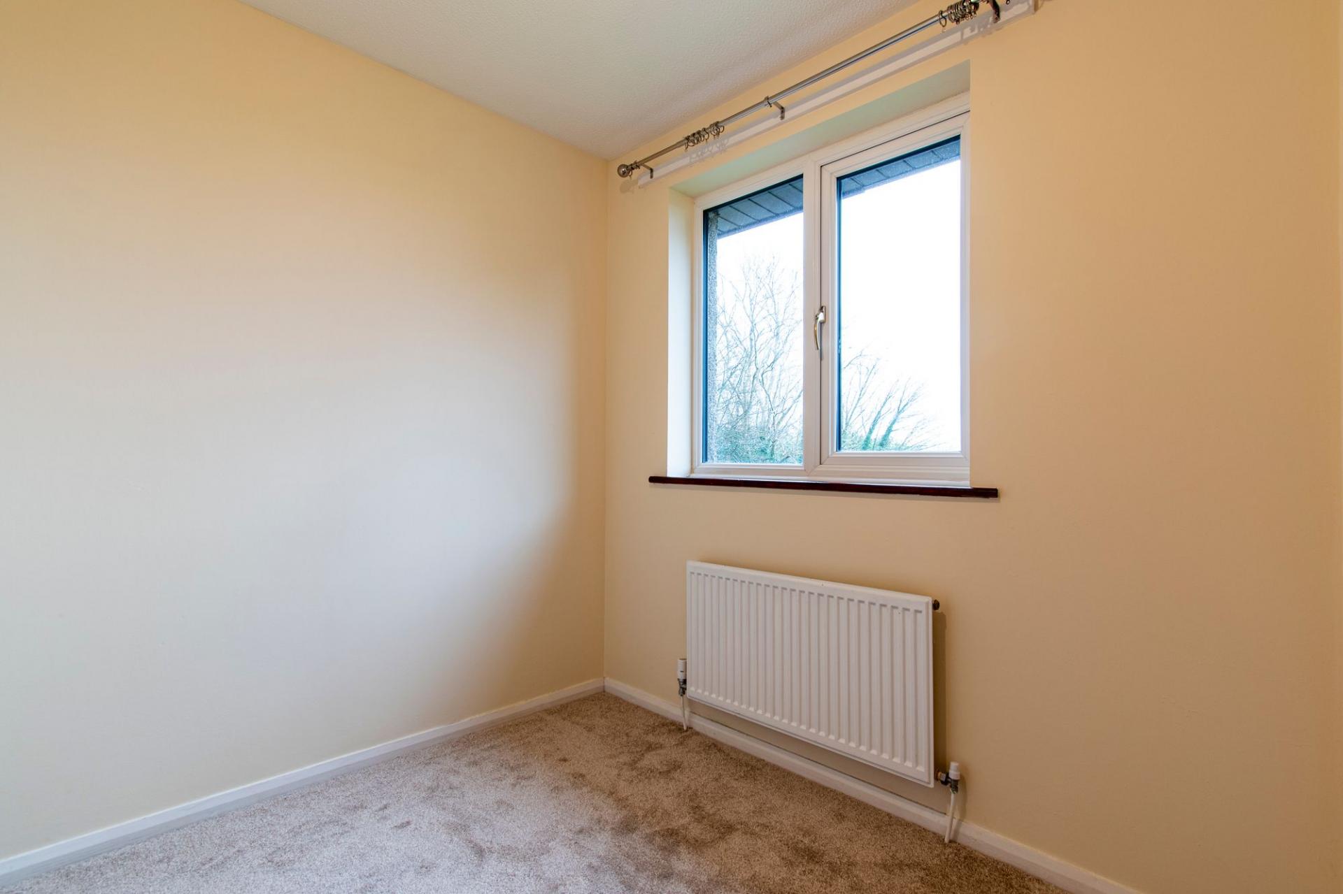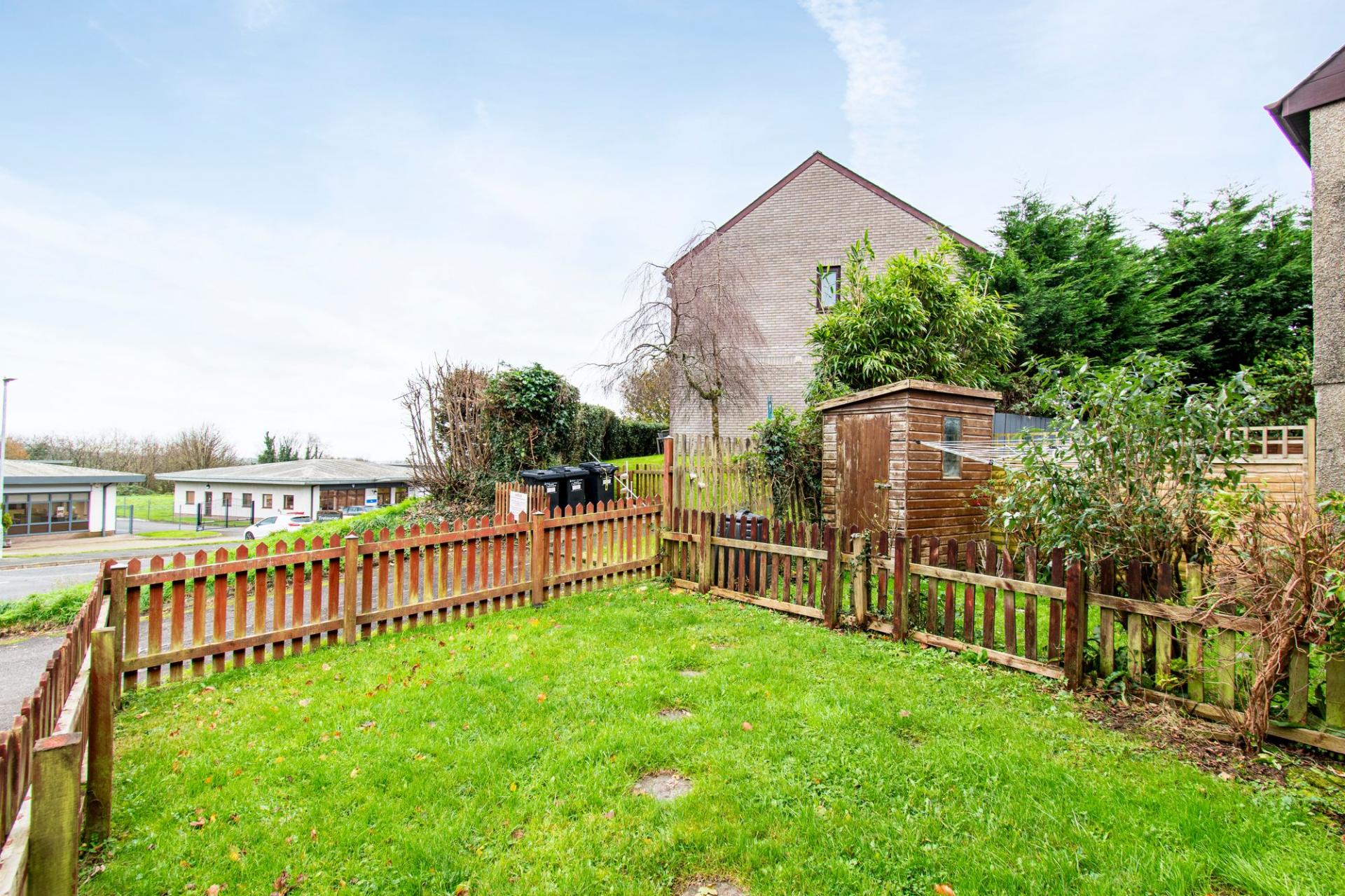 The rear garden is of low-maintenance, with a patio and space for a shed. The front includes a tarmac parking space beside a small lawn.