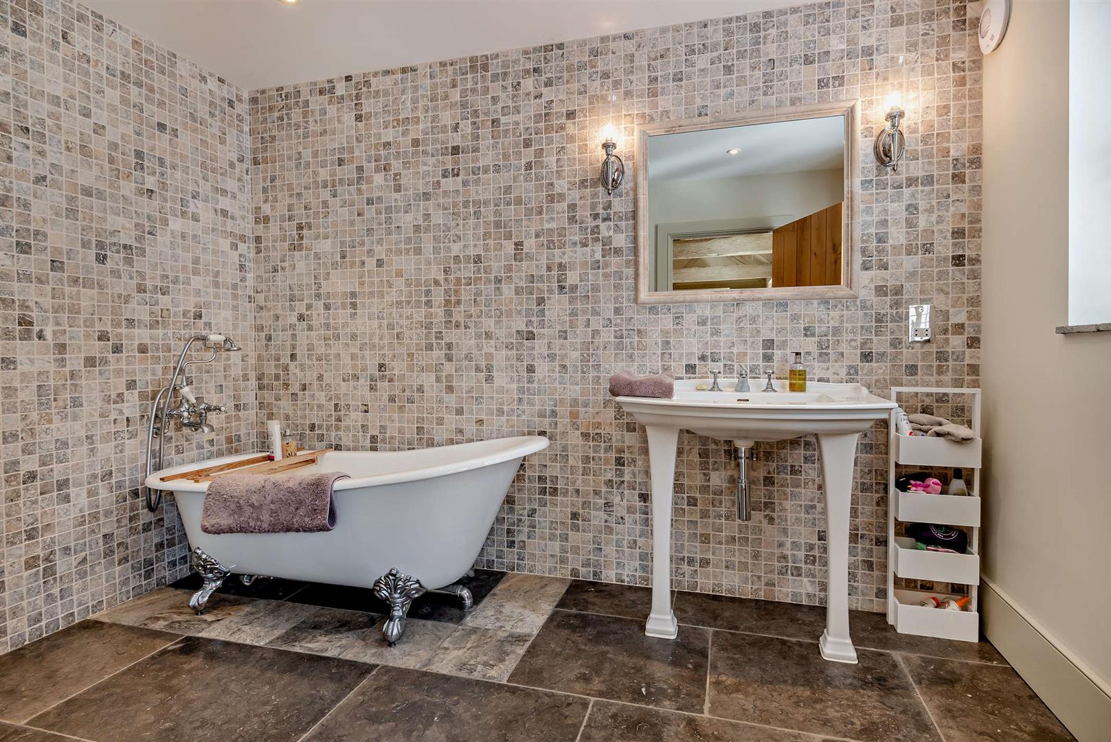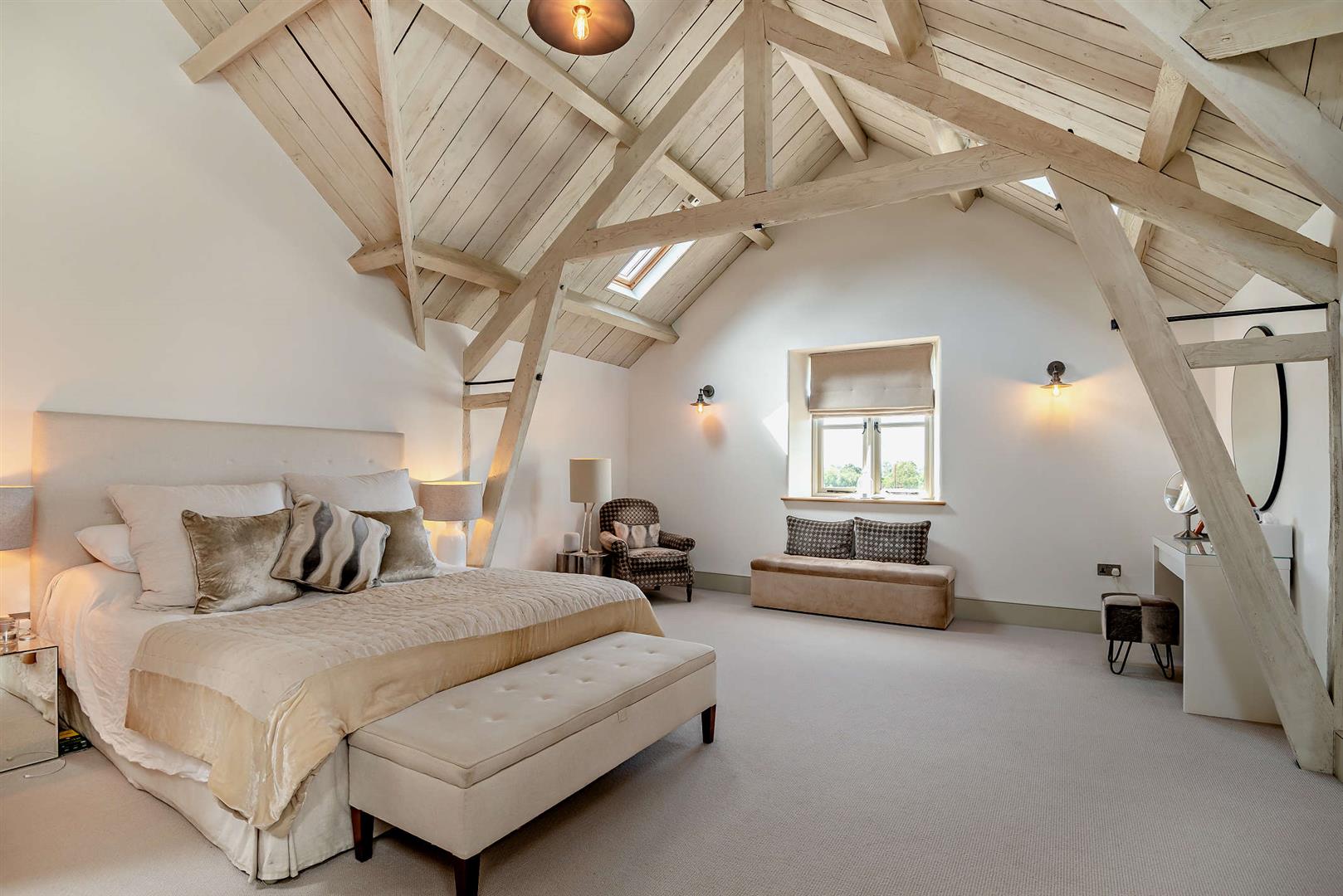 The master bedroom, complete with an en-suite bathroom and dressing room, enjoys the luxury of occupying the entire top floor, offering breath-taking views of the Cotswold countryside.