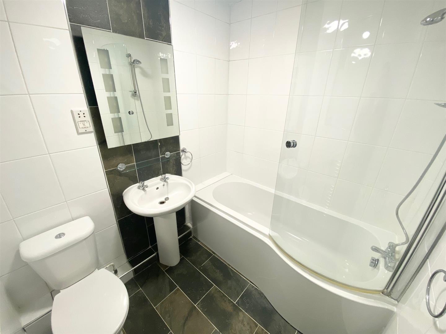 Bathroom - Tiled walls and floor, P-Shaped Panelled Bath with glass bath panel, combination shower, vanity sink unit, low level w.c. ladder towel rail.