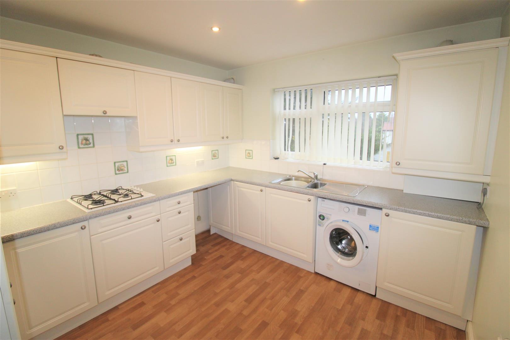 Kitchen - Double glazed window, radiator, boiler, kitchen comprises of a range of fitted base and wall units with integrated fridge/ freezer, cooker and hob, extractor hood, washing machine