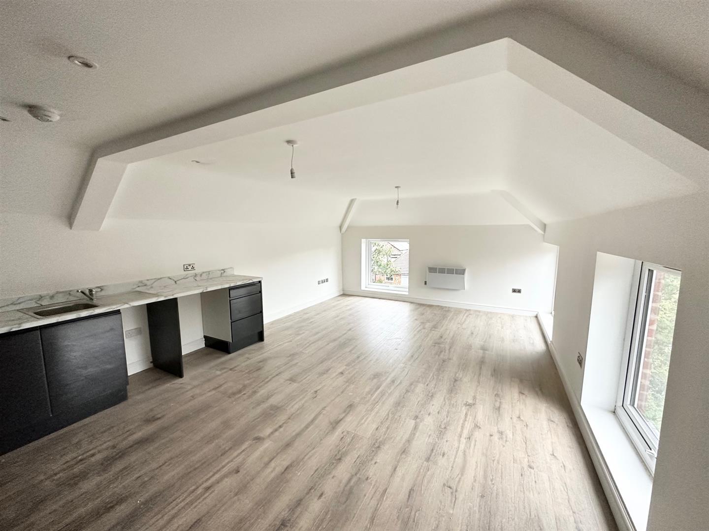 Open Plan Lounge Kitchen - 3 x Double glazed windows , wall heaters, kitchen comprises of a range of fitted base and wall units with integrated appliances including oven hob, fridge freezer, dishwasher and washing machine