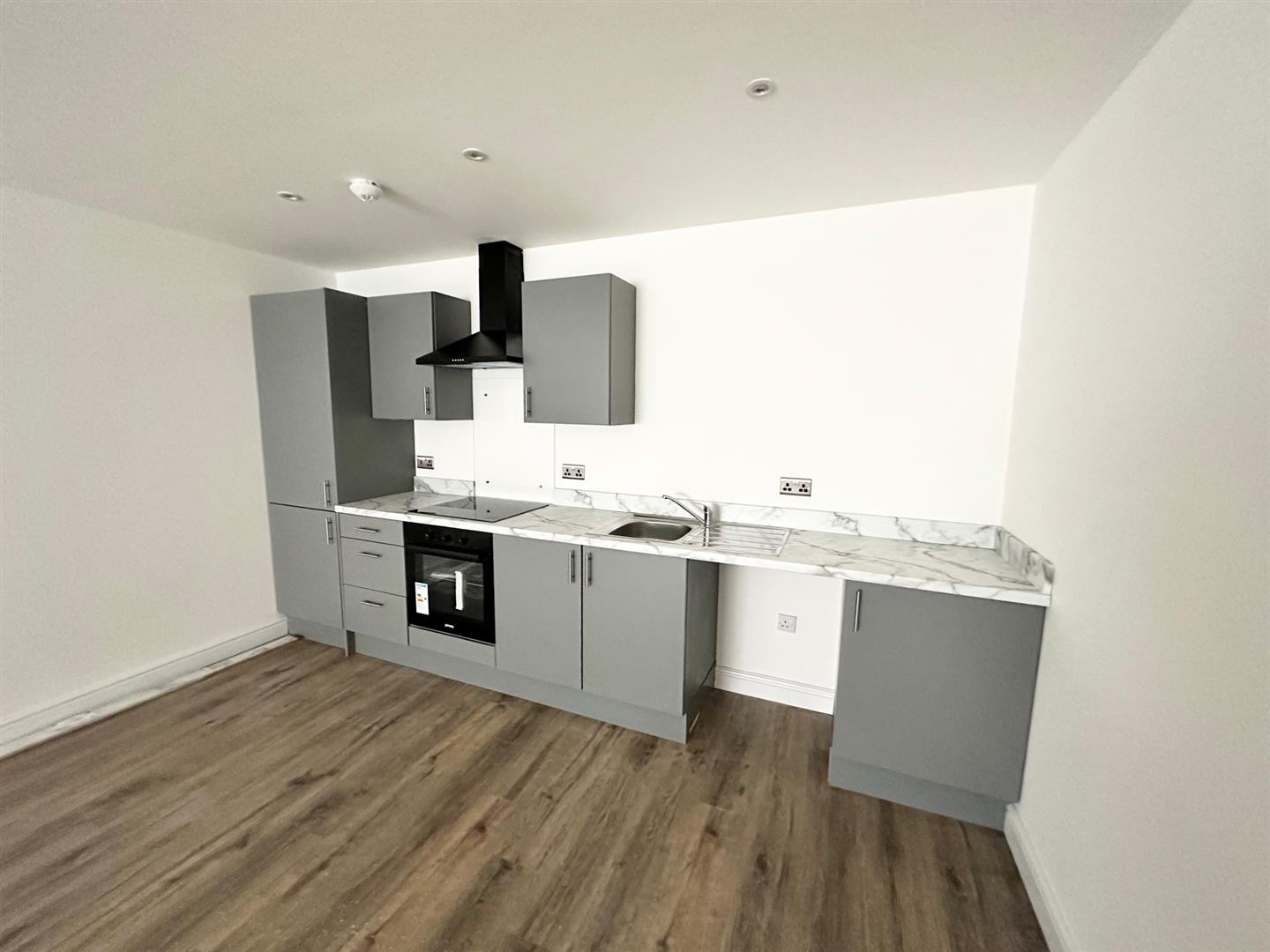 Open Plan Lounge Kitchen - Double glazed windows, laminate flooring, electric wall heaters, kitchen comprises of fitted base and wall units with single stainless steel sink with mixer taps, integrated fridge/ freezer, oven, hob and extractor hood. plumbing for washing machine.