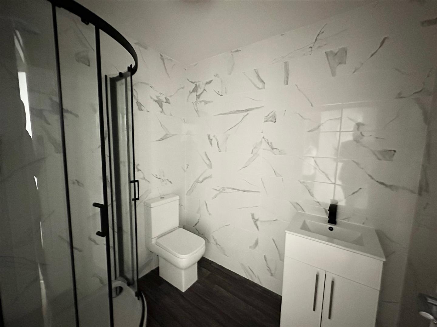 Shower Room - High gloss wall tiles, large walk in corner shower unit with enclosure, electric shower, vanity sink low level w.c.