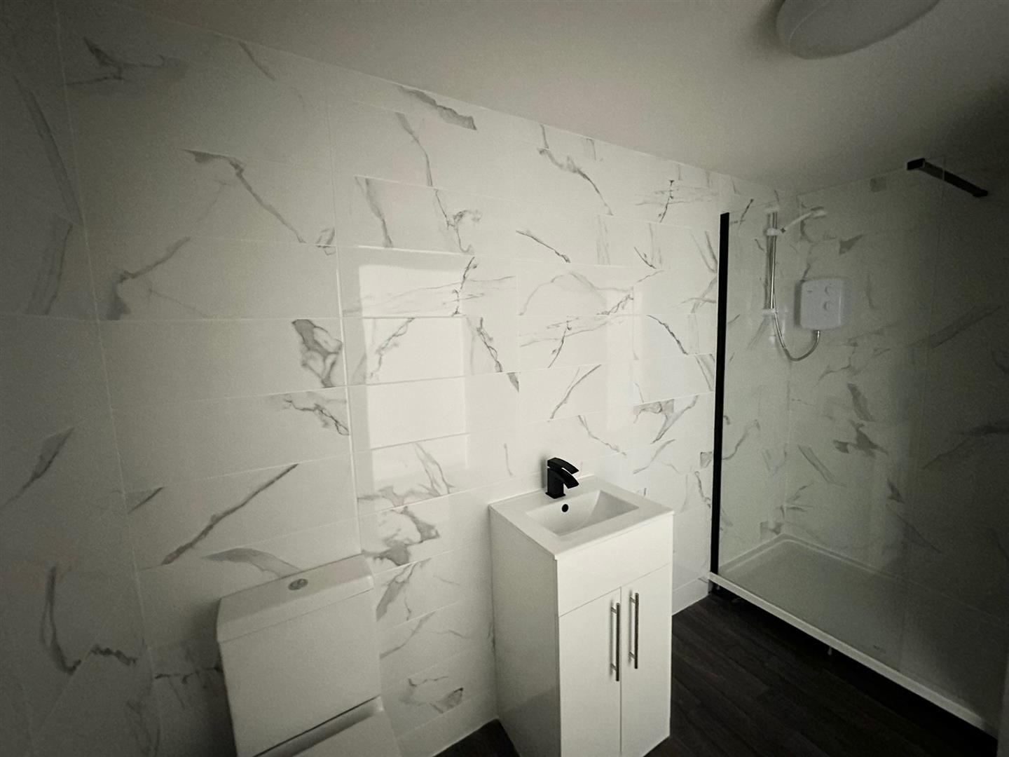 Shower Room - High gloss wall tiles, large walk in shower unit , electric shower, vanity sink low level w.c.