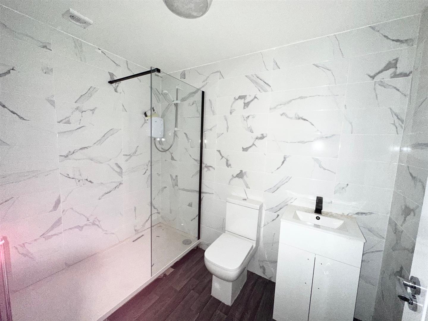 Shower Room - Fully tiled, large walk in shower with glass screen and electric shower, vanity sink unit, low level w.c.