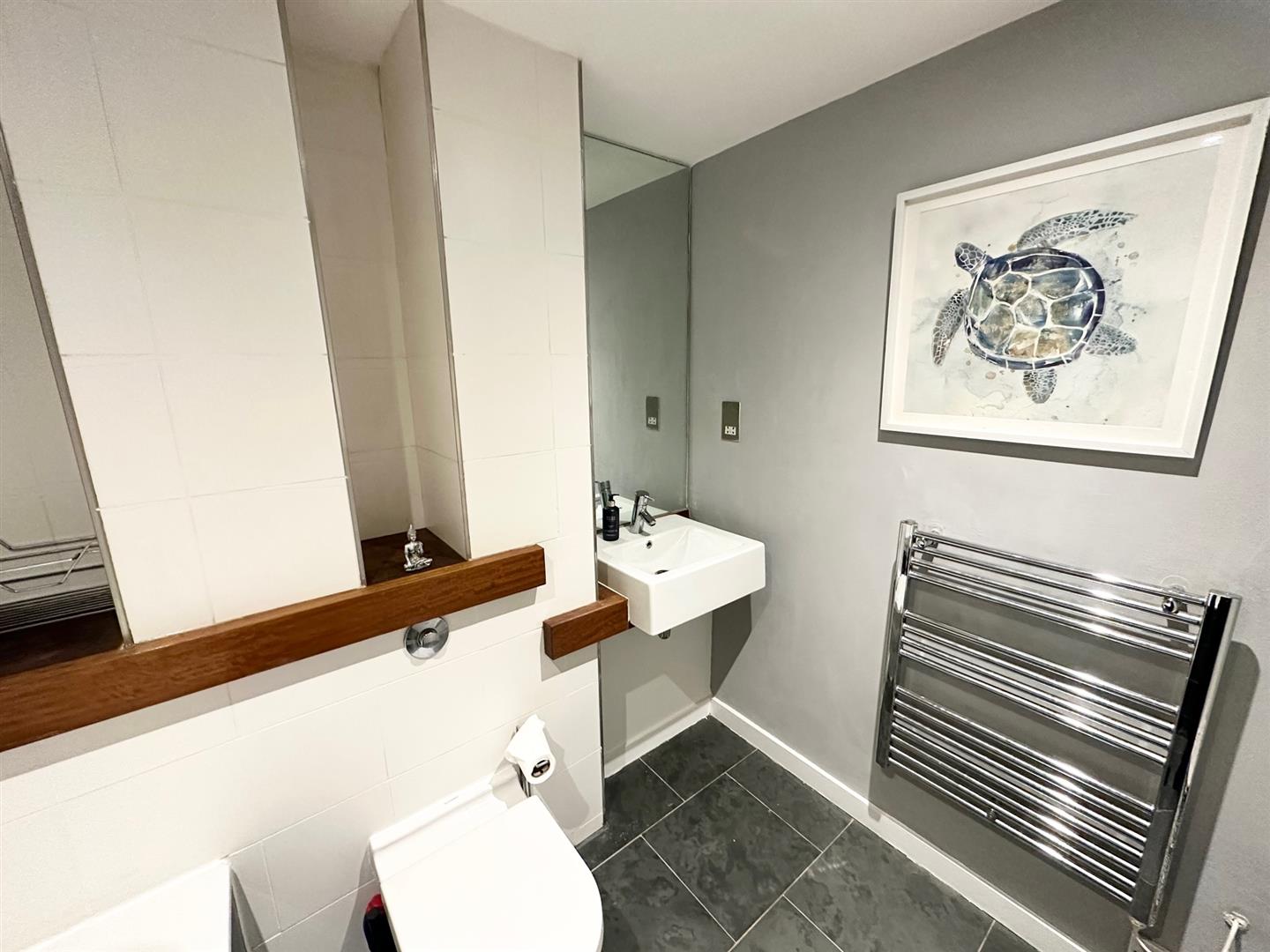 Bathroom - Fully tiled floor and part tiled walls, bathroom comprises of panelled bath with shower over, low level w.c. and sink, ladder towel rail.