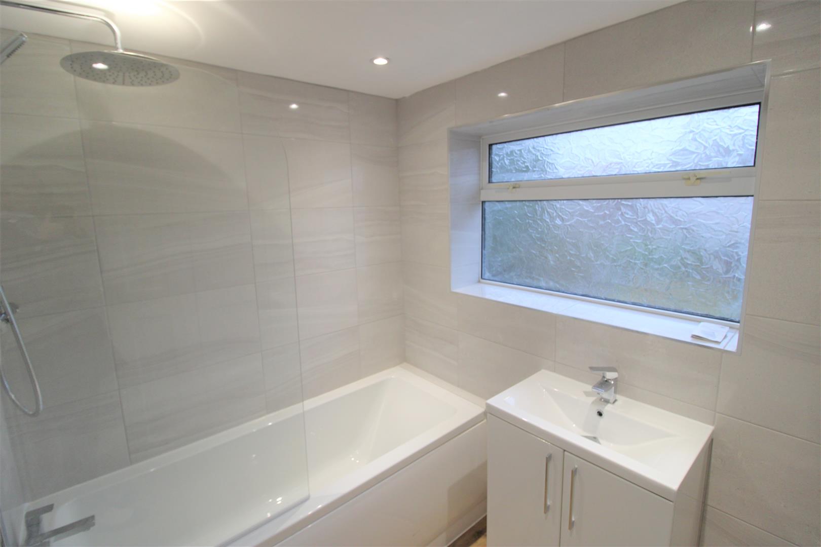 Bathroom - UPVC double glazed window, fully tiled walls and flooring, vanity sink unit with waterfall tap, bath with shower over, shower screen, built in storage cupboard housing boiler.