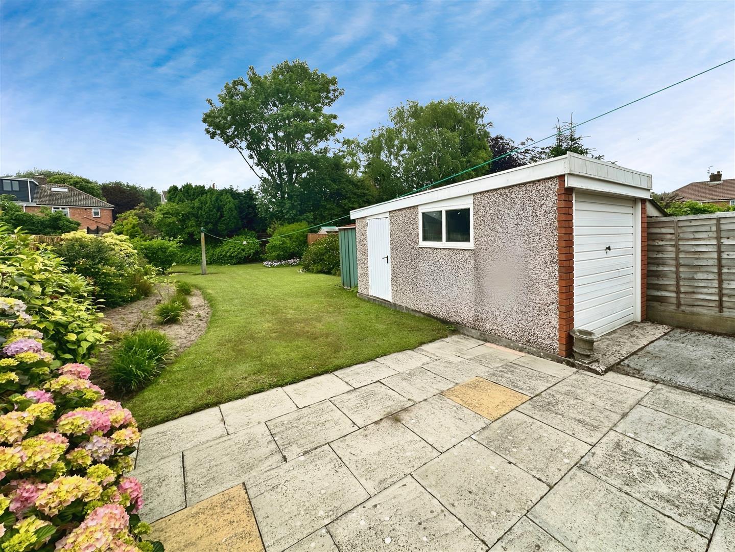 Rear Exterior - Detached garage, paved patio are, law with mature planted boarders