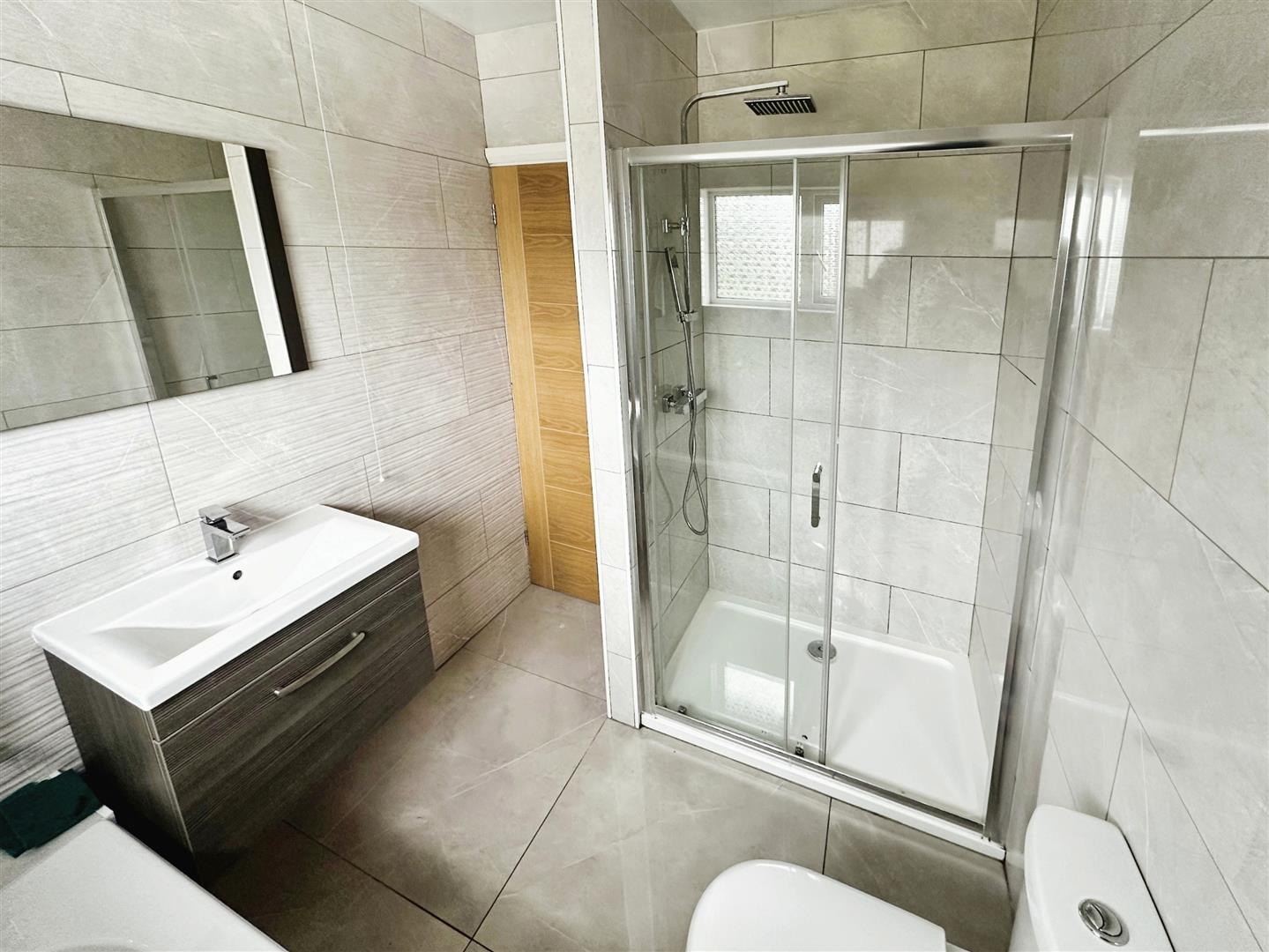 Bathroom - Double glazed window, fully tiled walls and flooring, walk in shower with glazed surround, bath, vanity sink unit with mirror above, low level. w.c.
