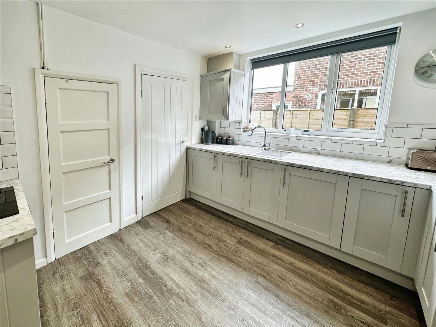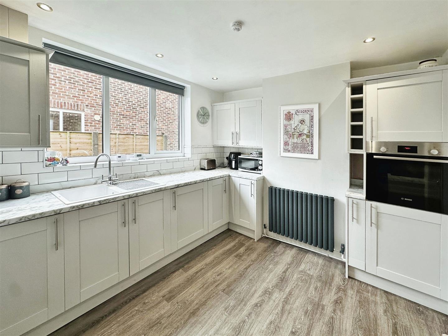 Kitchen - Double glazed window , radiator kitchen comprises of a range of fitted wall and base units with integrated appliances include washing machine, under counter fridge, oven and hob, wood effect laminate flooring
