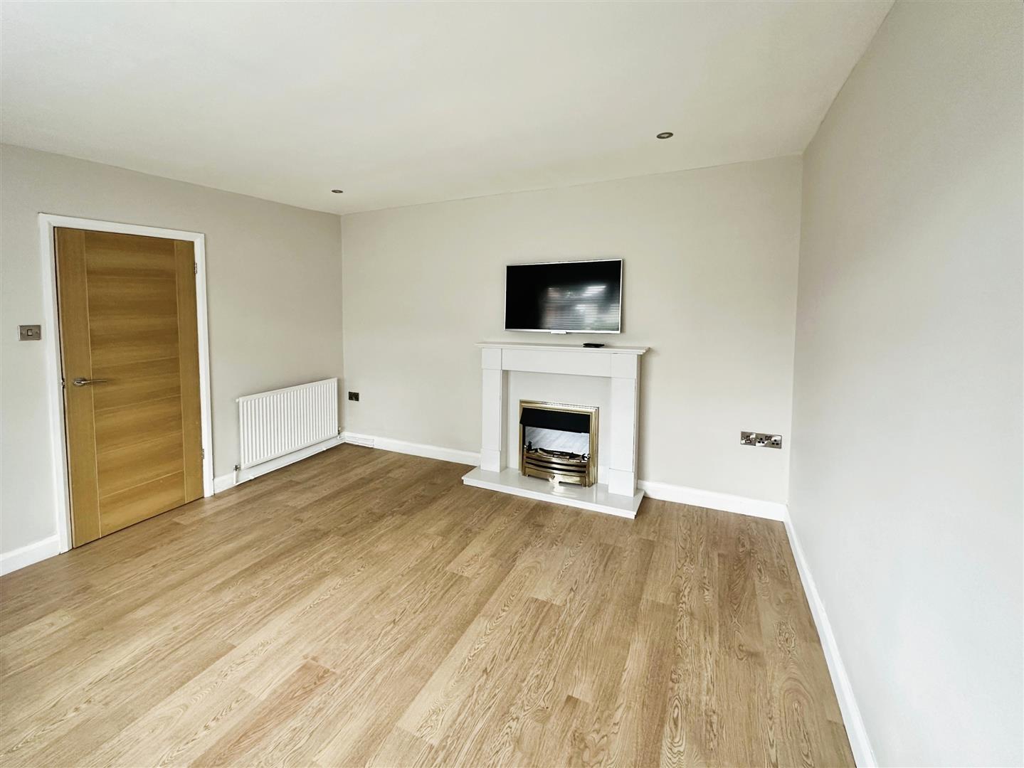 Lounge - Double glazed window, feature fire place, wood effect laminate flooring and radiator.