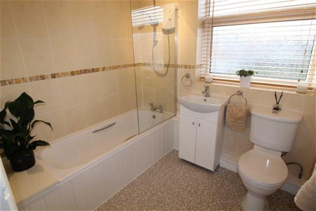 Bathroom - Double glazed window, tiled walls, panelled bath with electric shower over and glass shower screen, vanity sink unit with cupboard below, low level w.c. ladder towel rail.