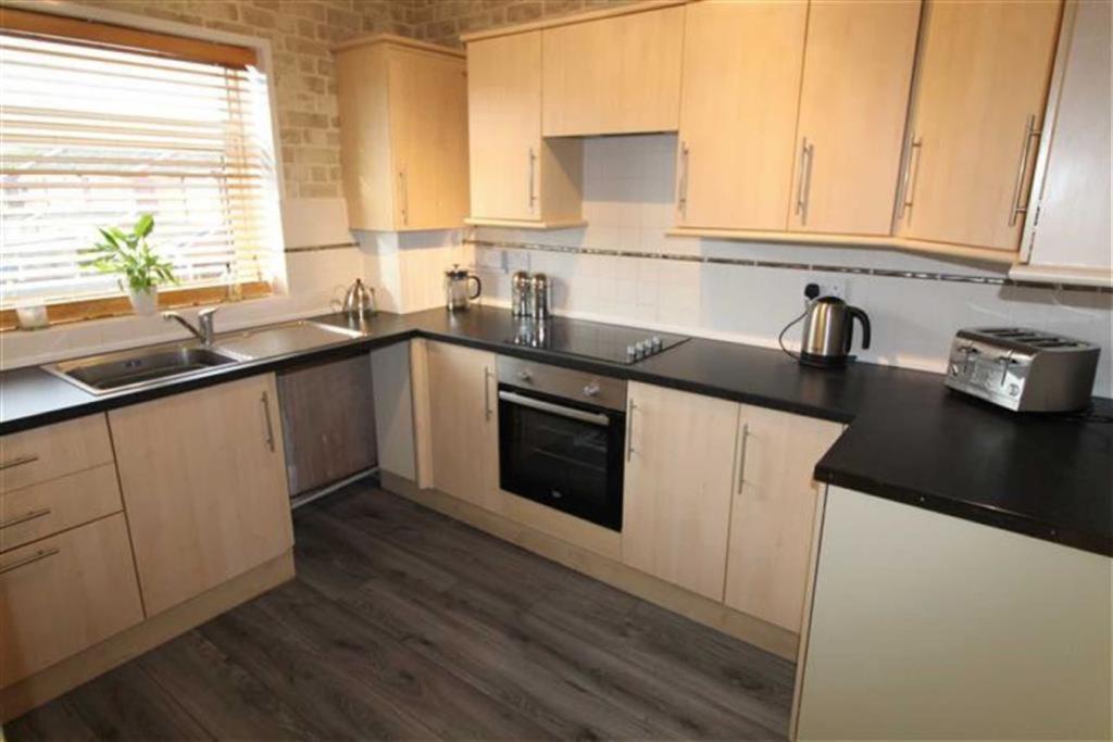 Kitchen - Double Glazed window, range of fitted base and wall units, single drainer sink with mixer tap, integrated electric oven and hob, extractor hood, plumbing for washing machine.