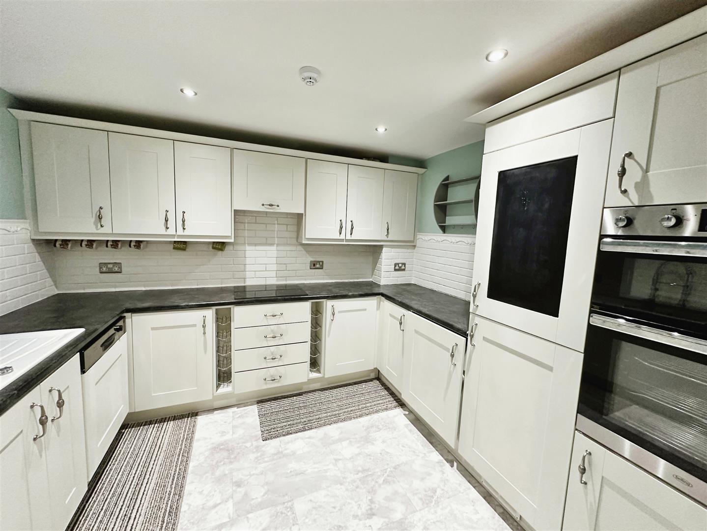 Kitchen - Tile effect Karndeen floor, part tiled walls, kitchen comprises of a range of fitted base and wall units, inset ceramic 1 and 1/2 sink with draining board and mixer tap, appliances include Fridge/ Freezer, Washing machine, dishwasher, ceramic hob, extractor fan.