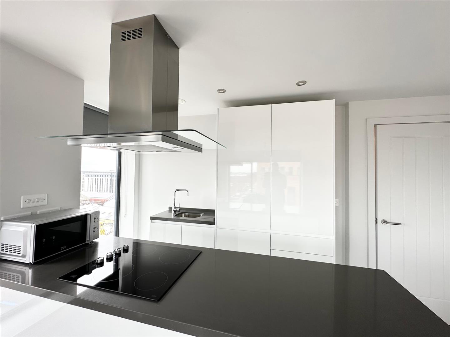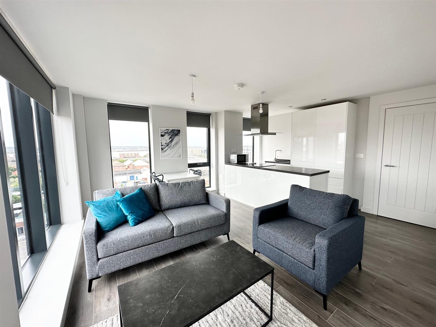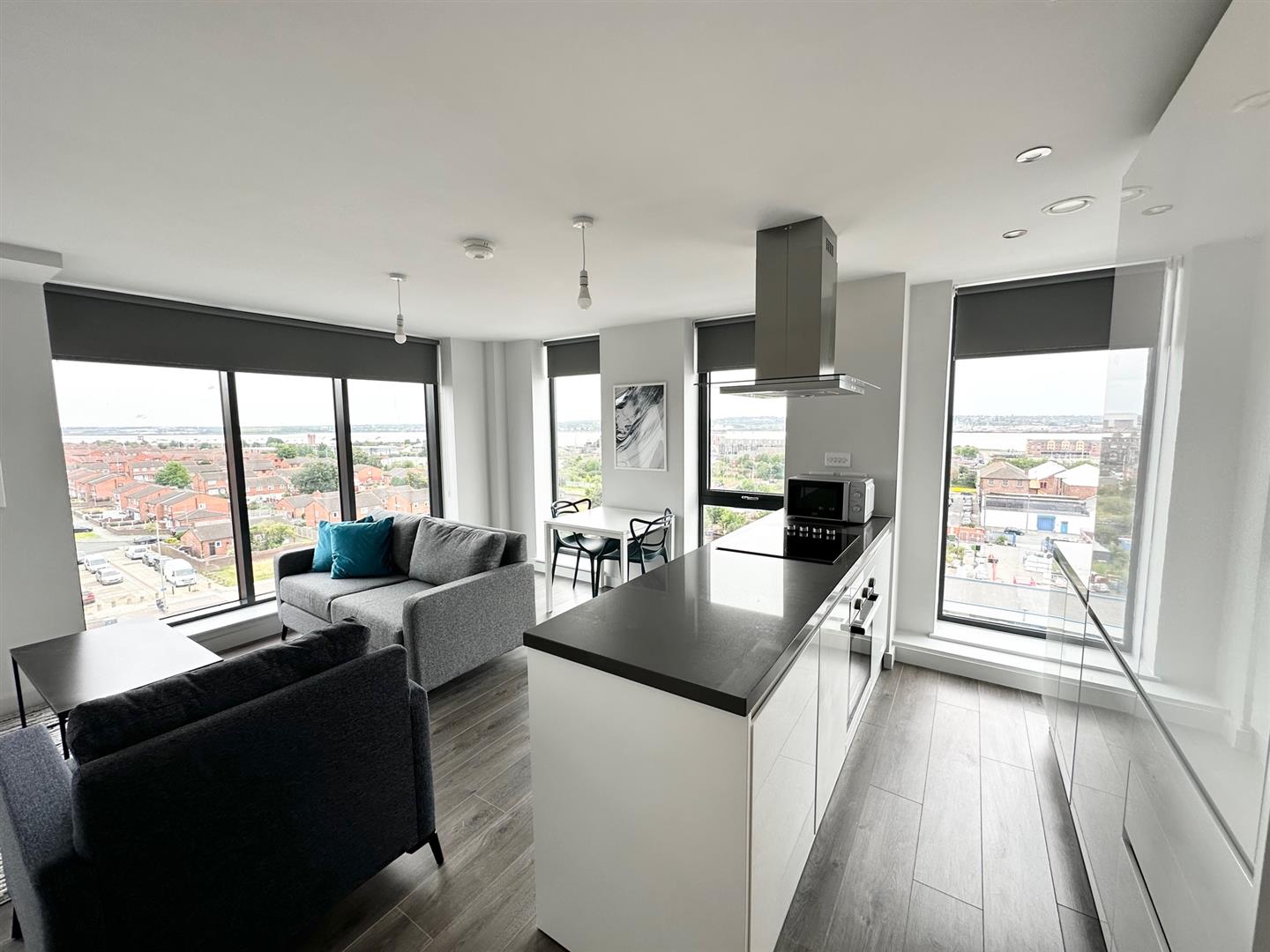 with floor-to-ceiling windows giving views of the city, the River Mersey and iconic landmarks such as the Anglican Cathedral.