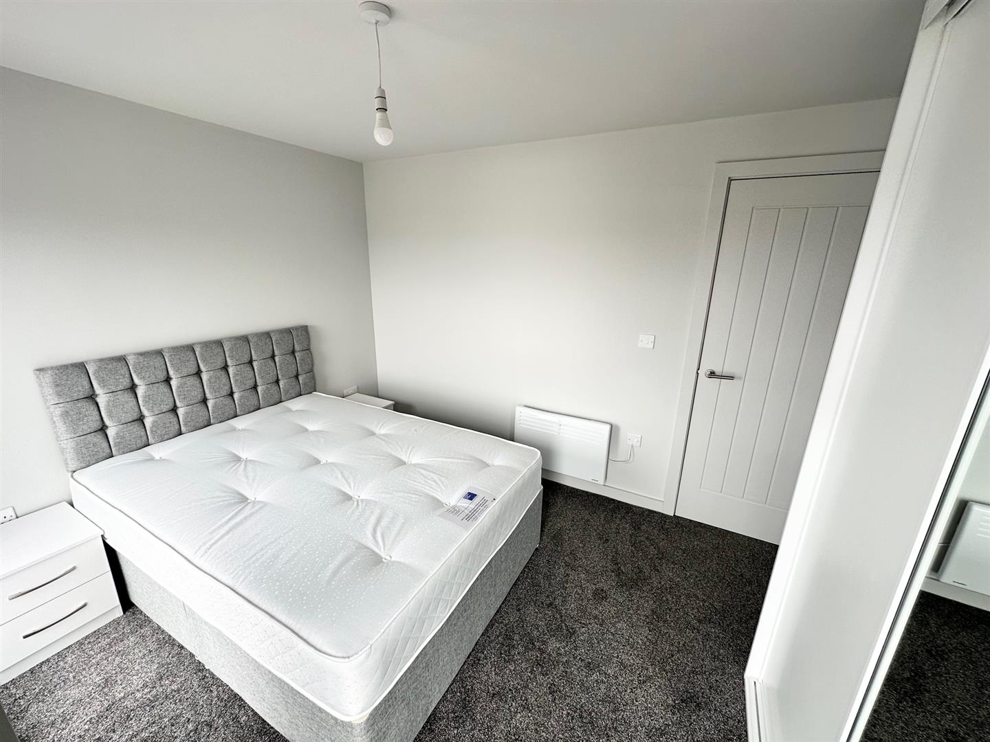 Bedroom - Double glazed windows, carpet, electric wall heater, furnishing includes double bed and mattress , bedside tables, built in wardrobes